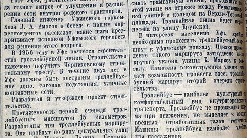«Троллейбус – наиболее культурный и комфортабельный вид внутригородского транспорта, не производит шума при движении, не выделяет в воздух вредных отработанных газов, удобен для пассажиров», - написала газета 18 ноября 1955 года, сообщив при этом, что «в Уфе строительство троллейбусной линии начнется в 1956 году».