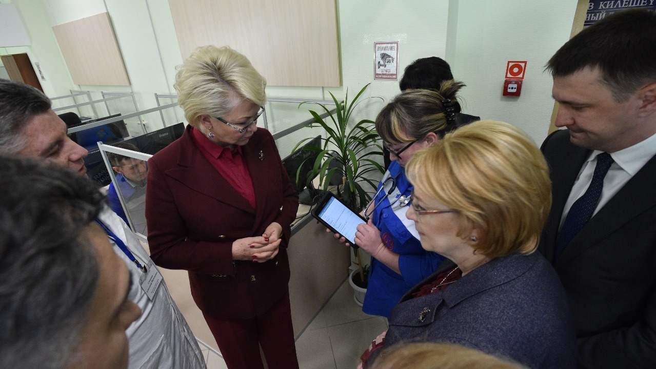 Веронике Скворцовой показали работу планшетов, которыми оснастили бригады скорой помощи. В них доступна вся информация о больном, к которому направляются врачи - хронические заболевания, аллергии, возраст. Также на приеме врач скорой помощи заполняет все данные о пациенте, которые доступны онлайн в системе РМИАС.
