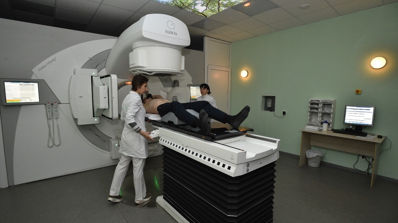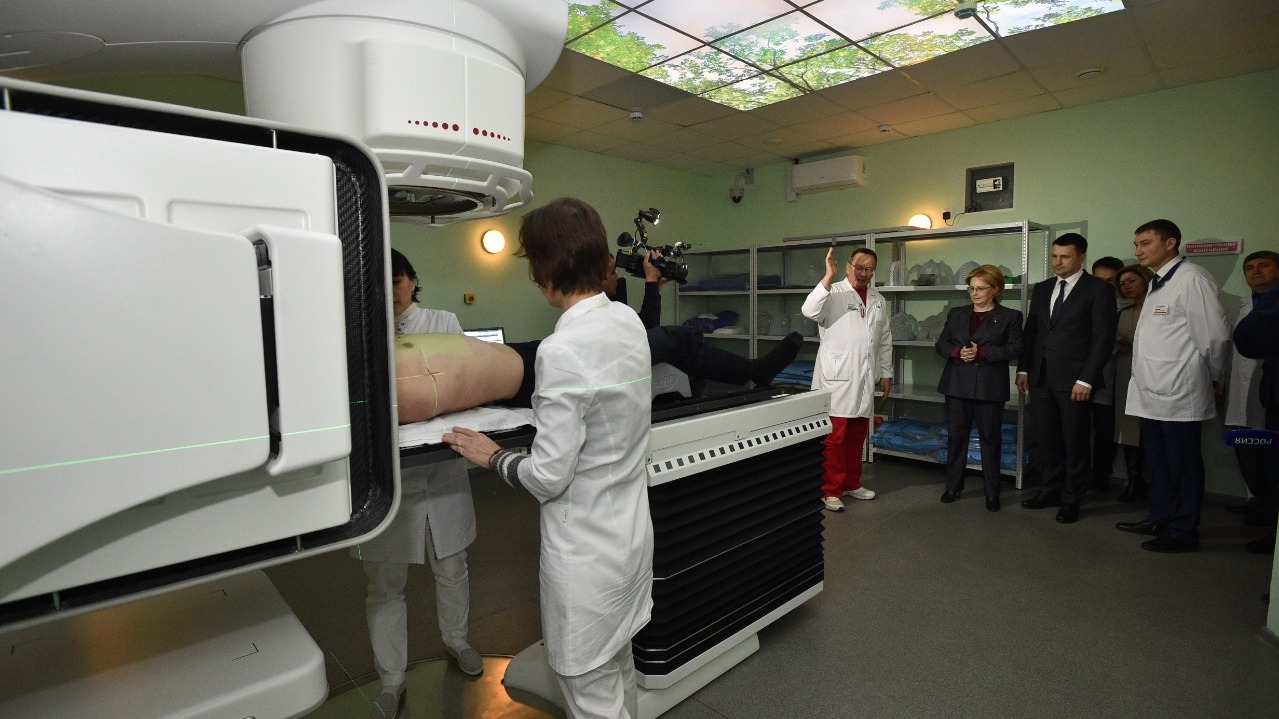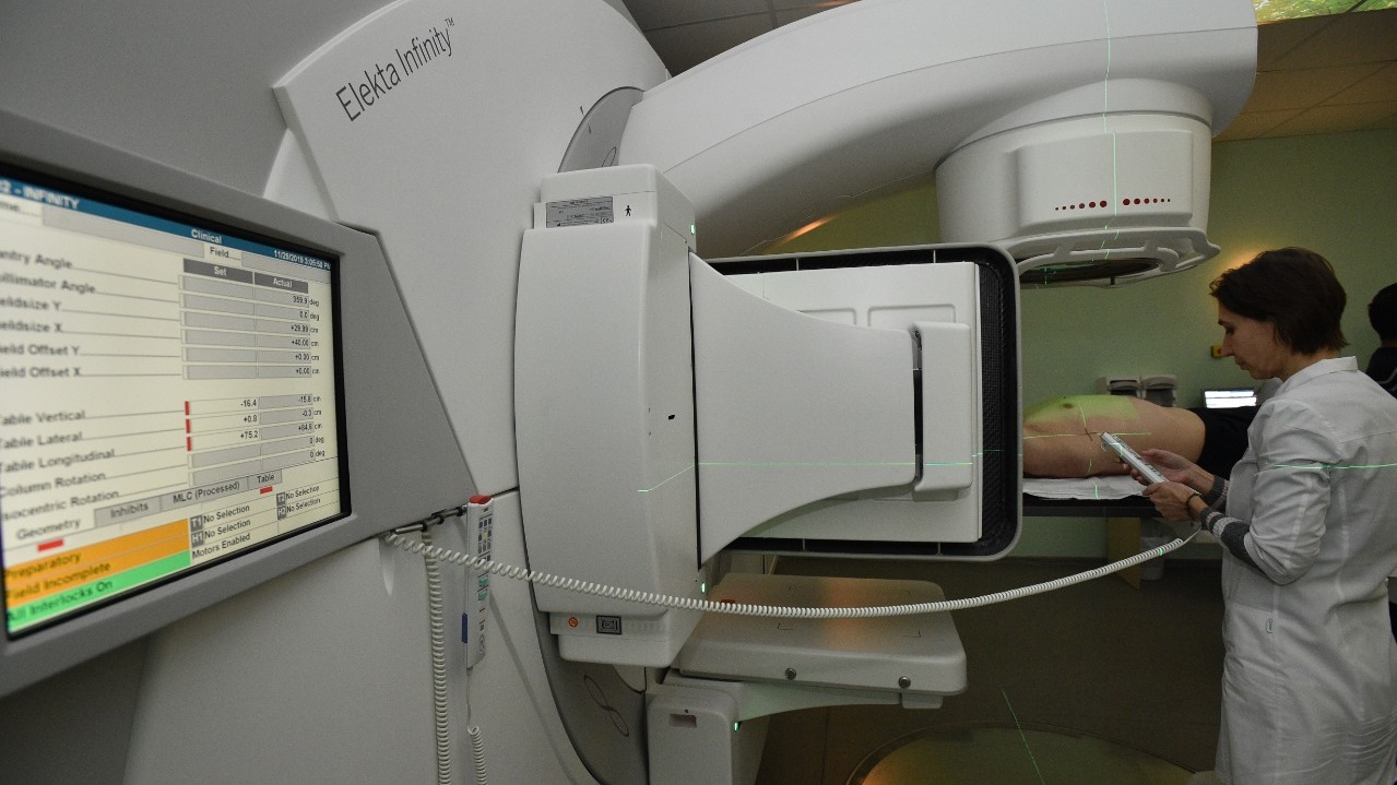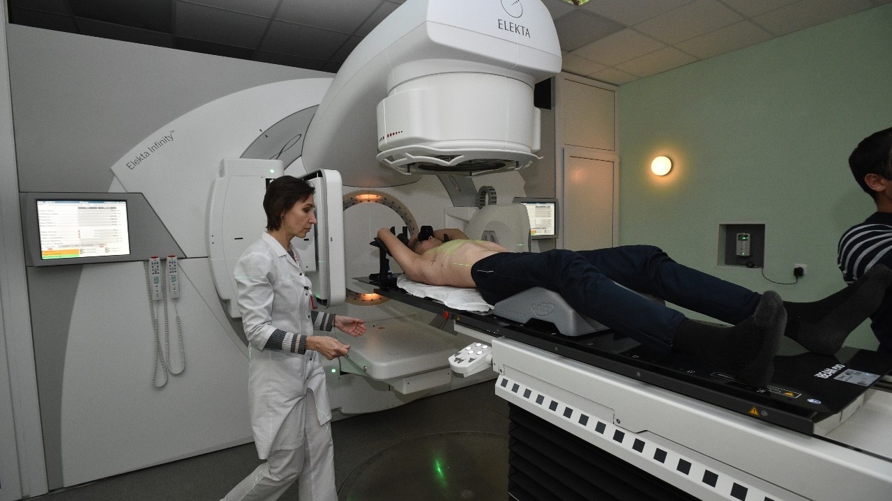 «За последнее время произошло мощное переоснащение радиологической службы, появилась первая установка, которая способна реализовать все доступные на сегодня технологии лечения, которое проходит под контролем дыхания пациента. К весне следующего года в онкодиспансере планируют повсеместно ввести в качестве альтернативы оперативному лечению стереотаксическое облучение, и пациент сможет выбирать. Процедура длится до 15 минут. Аппарат универсальный, лечить можно любую локализацию опухоли на теле человека. Поле воздействия - от 2 до 40 см, при этом воздействовать можно на несколько мишеней», - отметил он.