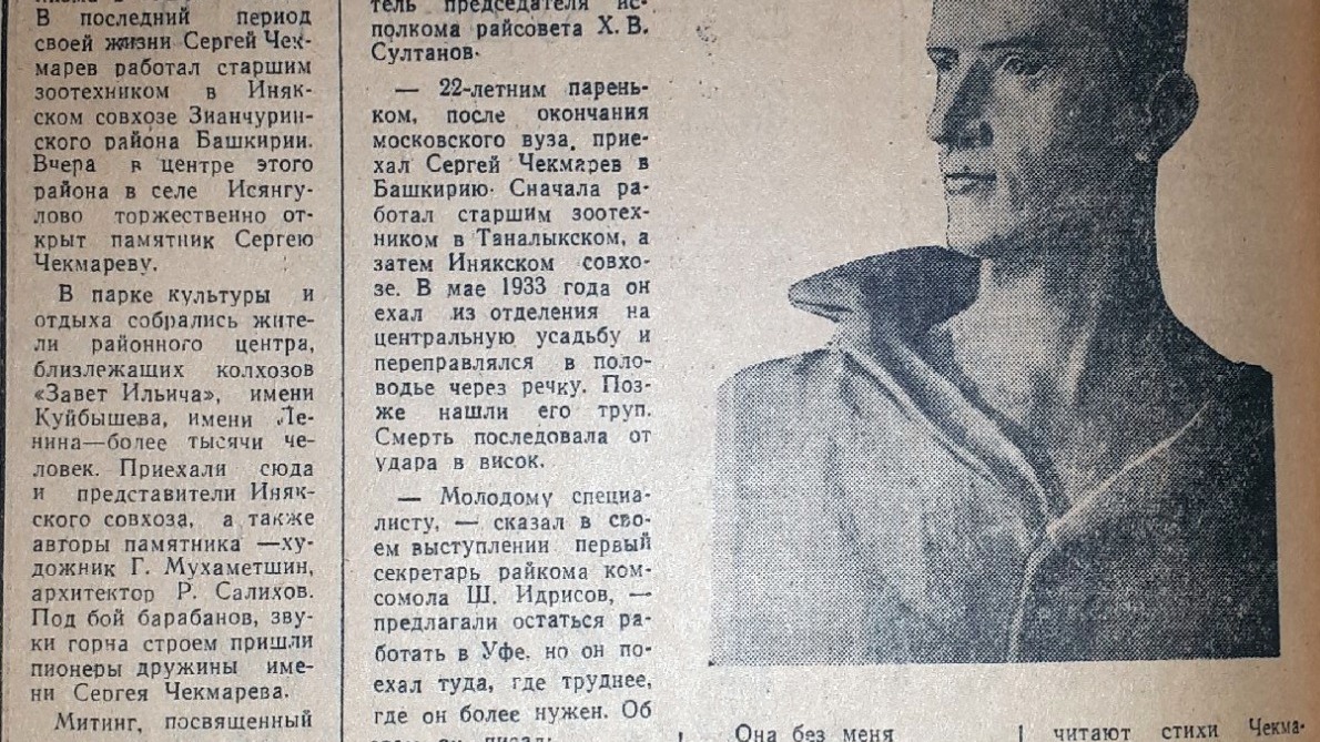 «22-летним пареньком, после окончания московского вуза, приехал Сергей Чекмарев в Башкирию. Сначала работал старшим зоотехником в Таналыкском, а затем Инякском совхозе, - взволнованно рассказывает зампредседателя исполкома райсовета Х. В. Султанов о вехах короткой, но яркой биографии поэта-комсомольца. - В мае 1933 года он ехал из отделения на центральную усадьбу и переправлялся в половодье через речку. Позже нашли его труп. Смерть последовала от удара в висок», - уточнил он.