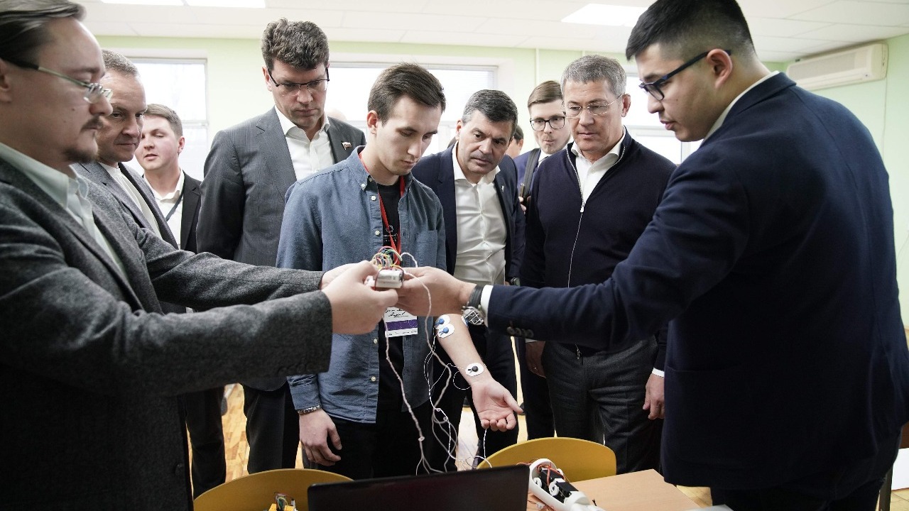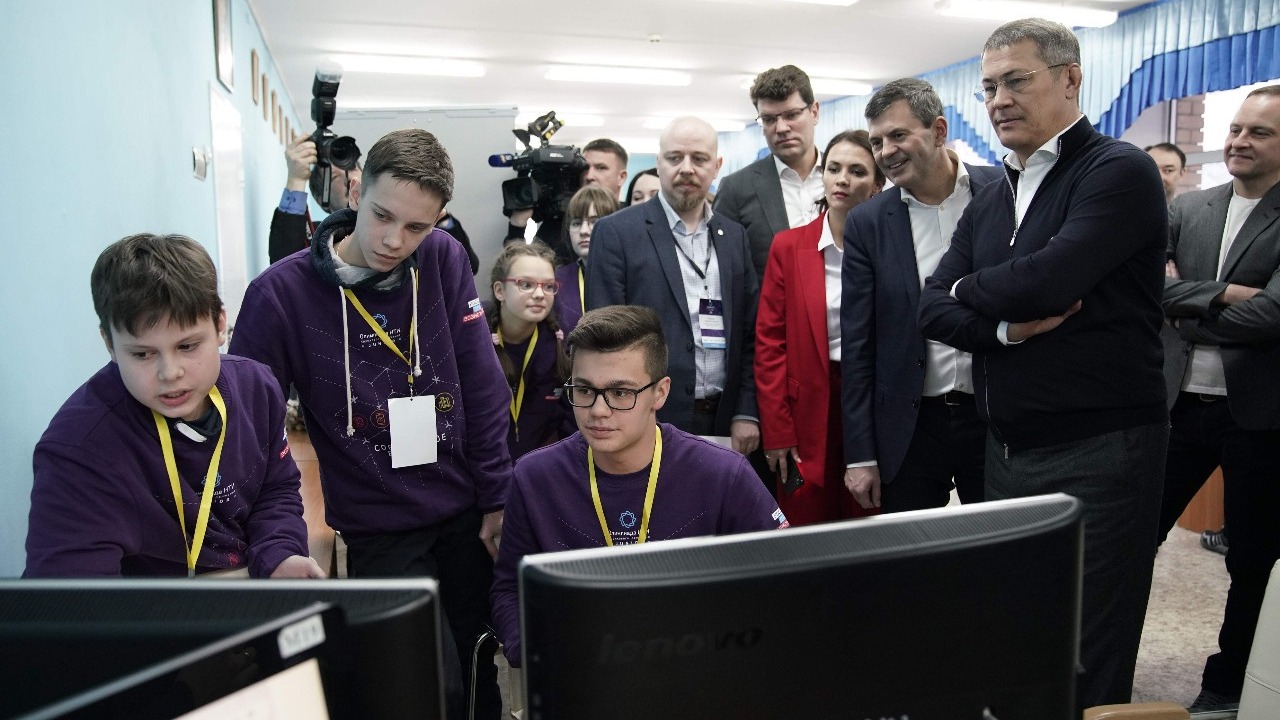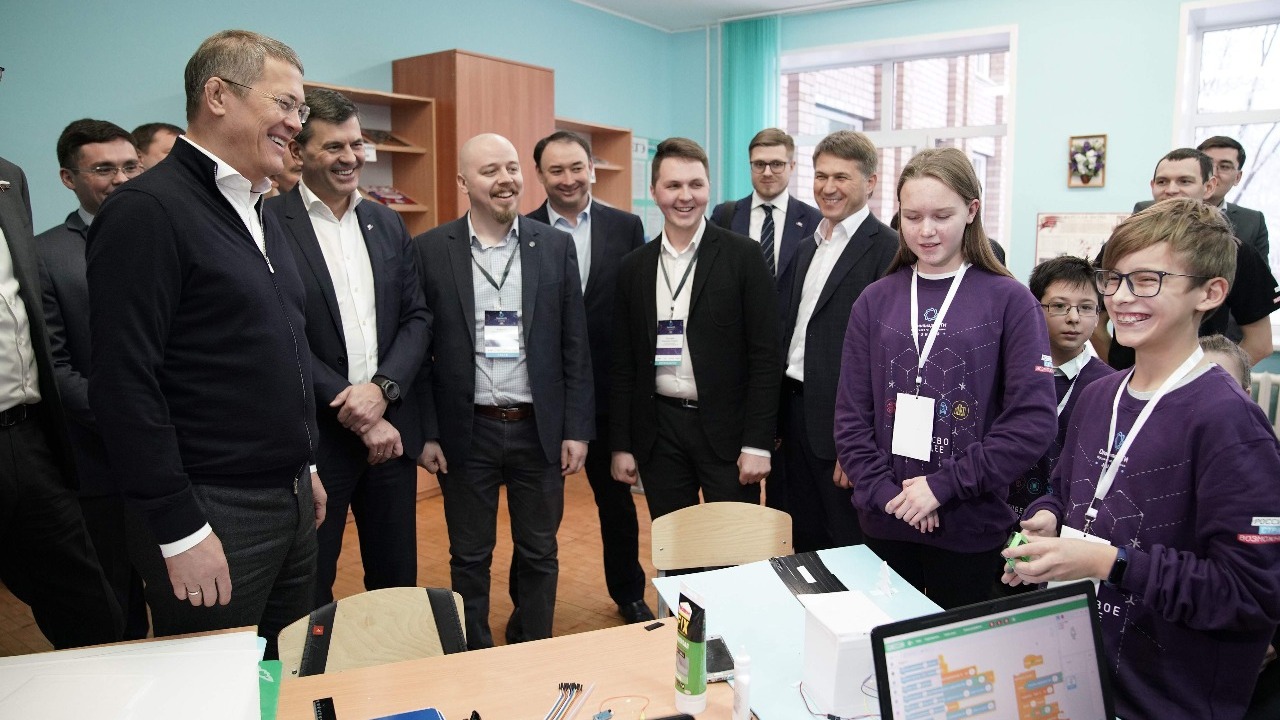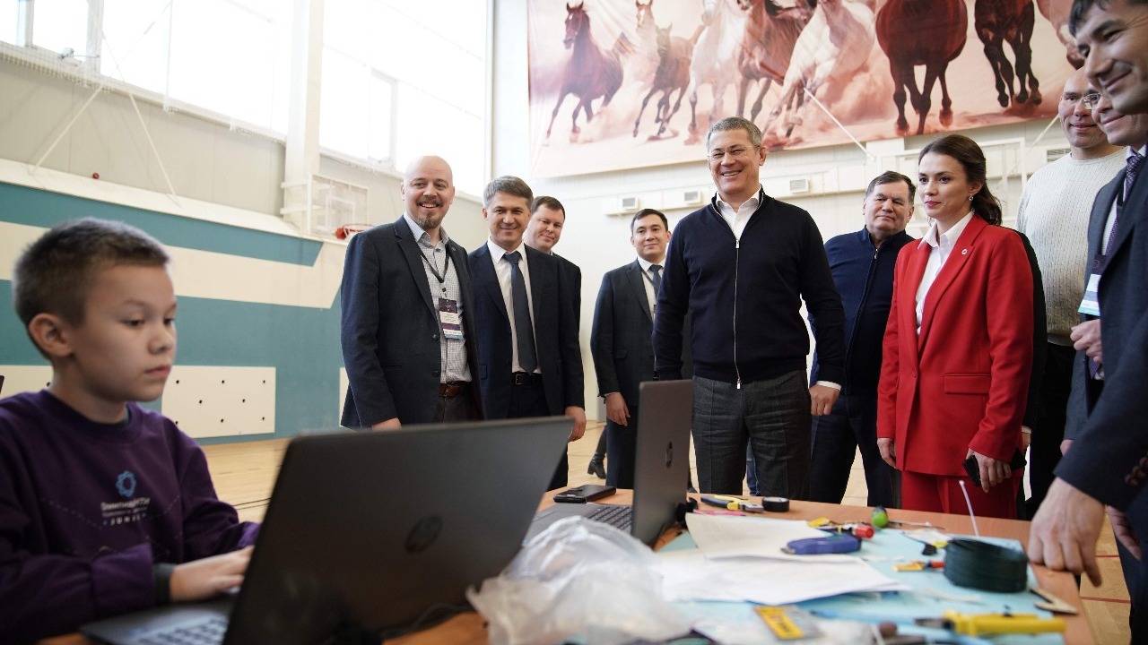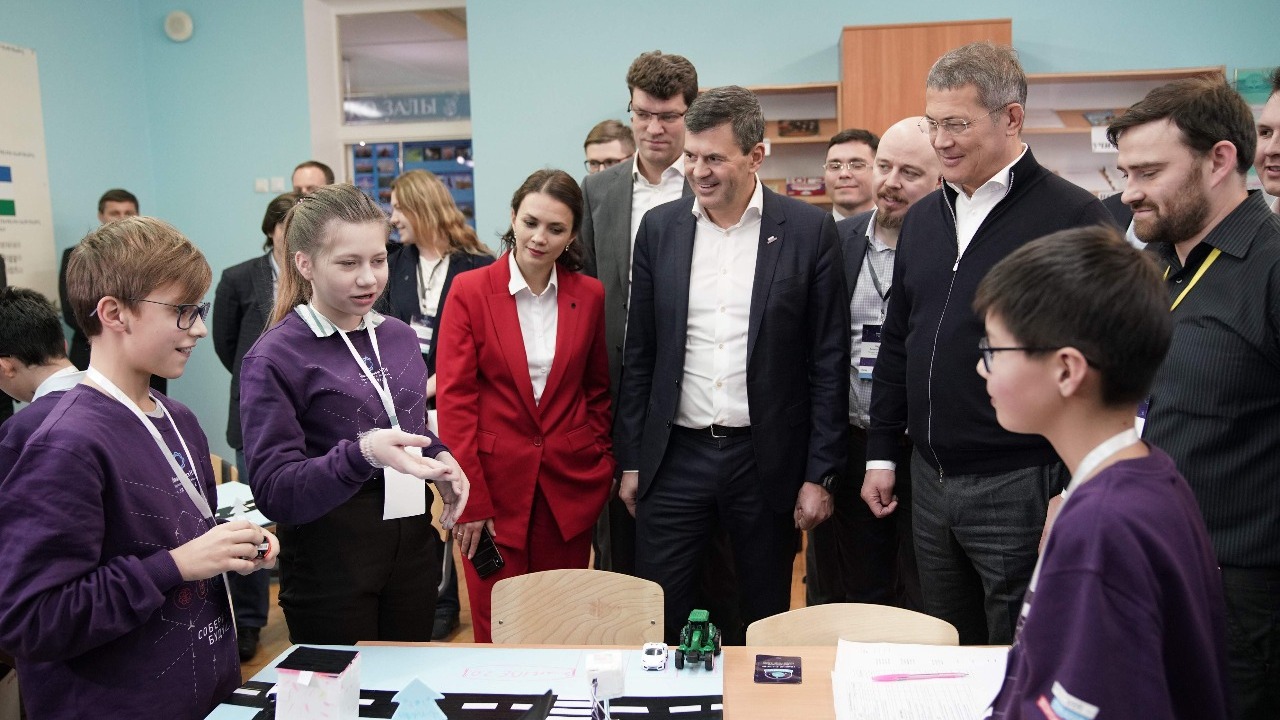 УФА, 15 дек 2019. /ИА «Башинформ», Азат Гиззатуллин/. Сегодня в Башкирской республиканской гимназии имени Рами Гарипова прошел финал первой Олимпиады Кружкового движения НТИ.Junior. Его участниками стали около 70 учеников 5-7 классов из Башкортостана, Тюменской и Челябинской областей, успешно прошедших заочный тур. Посмотреть за ходом финала и пообщаться с ребятами в гимназию приехали генеральный директор АНО «Россия – страна возможностей» Алексей Комиссаров и глава Башкортостана Радий Хабиров. Они посмотрели за тем, как ученики выполняют задания олимпиады.