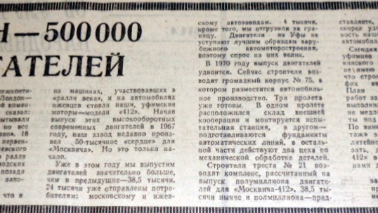 В газете отмечают, что и на машинах, участвовавших в «ралли века» Лондон – Сидней, и на автомобилях ижевцев стояли уфимские моторы – модели «412». Начав выпуск этих двигателей в 1967 году, к 1969-му уфимский завод произвел 50-тысячное «сердце» для «Москвича».