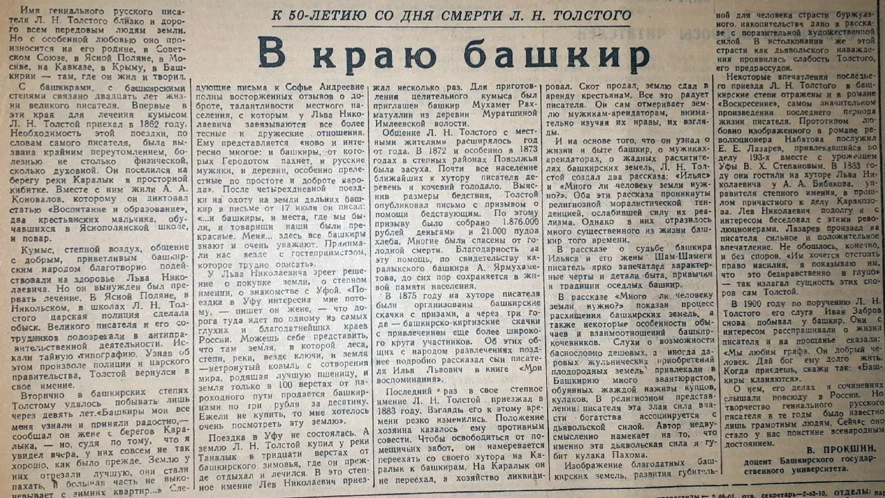 УФА, 20 янв 2020. /ИА «Башинформ»/. С башкирами и башкирскими степями связано 20 лет жизни великого писателя. Почему Лев Толстой хотел переехать к башкирам и за что башкиры его благодарят. Об этом и многом другом узнала газета «Советская Башкирия» в ноябре 1960 года. «Башинформ» продолжает знакомить читателей с материалами из Национального архива РБ.