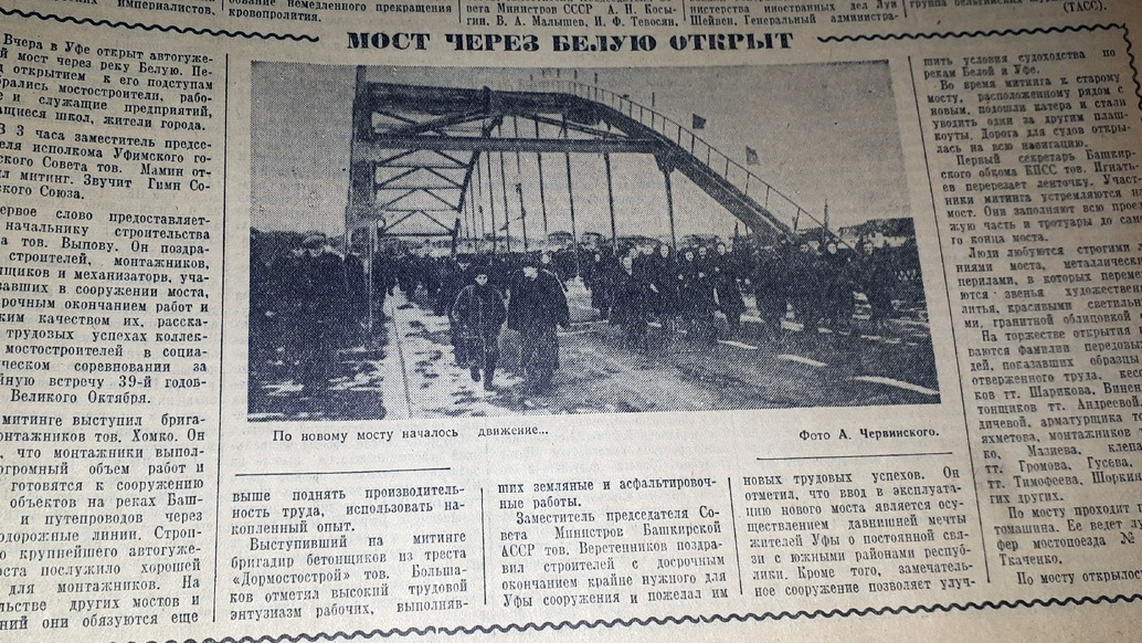 «Вчера в Уфе открыт автогужевой мост через реку Белую. Перед открытием к его подступам собрались мостостроители, рабочие и служащие предприятий, учащиеся школ, жители города», - информировала газета 4 ноября 1956 года.