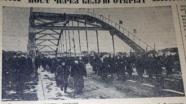 «По мосту проходит первая автомашина. Ее ведет лучший шофер мостопоезда № 414 Ткаченко. По мосту открылось движение», - передал с места события корреспондент газеты.