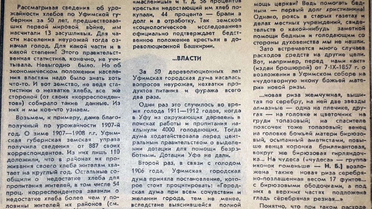 «Рассматривая сведения об урожайности хлебов по Уфимской губернии за 50 лет, предшествовавших Первой мировой войне, мы насчитали 13 засушливых», - информирует газета, отметив, что для части населения неурожай тогда означал голод. Но для какой части и в какой степени - правительственная статистика не учитывала. Невыгодно было. Однако для того, чтобы знать хоть что-то об экономическом положении населения, «земство, не ведя статистики о нехватке хлеба, все же стороной, от своих “корреспондентов”, собирало такие данные».