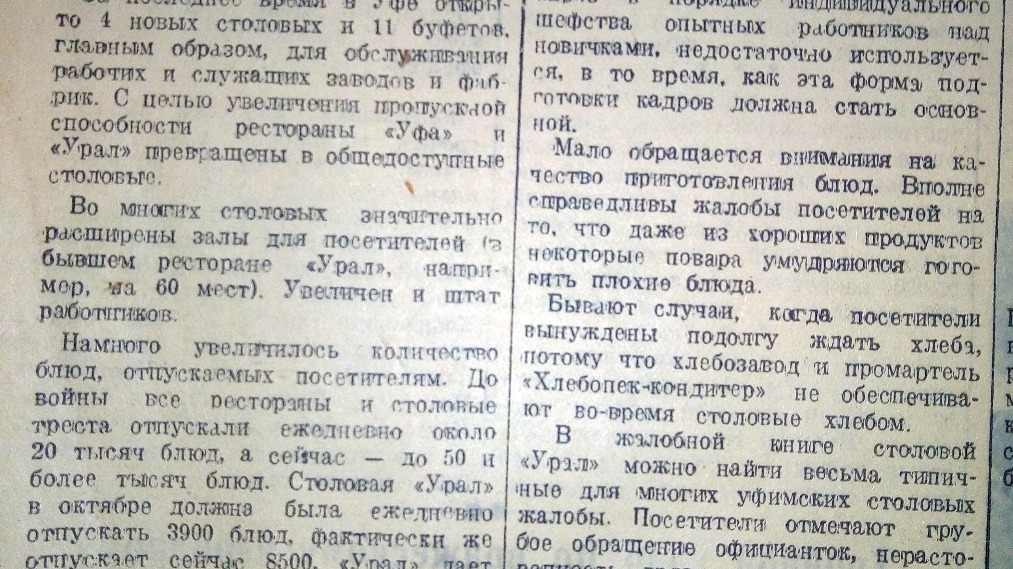 К концу декабря 1941 года в Уфе было открыто четыре новых столовых и 11 буфетов, главным образом, для обслуживания рабочих и служащих заводов и фабрик. «С целью увеличения пропускной способности рестораны «Уфа» и «Урал» превращены в общедоступные столовые», - информирует газета. При этом во многих столовых были значительно расширены залы для посетителей. В частности, в бывшем ресторане «Урал» добавилось еще 60 мест, увеличился и штат работников.