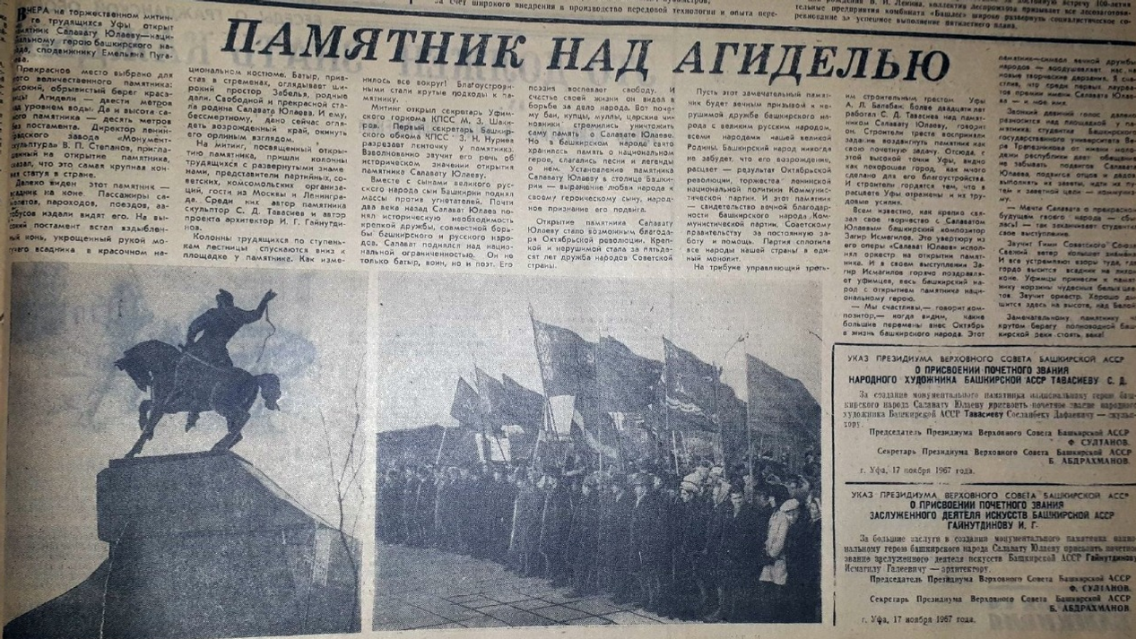 «Вчера на торжественном митинге трудящихся Уфы открыт памятник Салавату Юлаеву – национальному герою башкирского народа, сподвижнику Емельяна Пугачева», - информировала газета 18 ноября 1967 года.