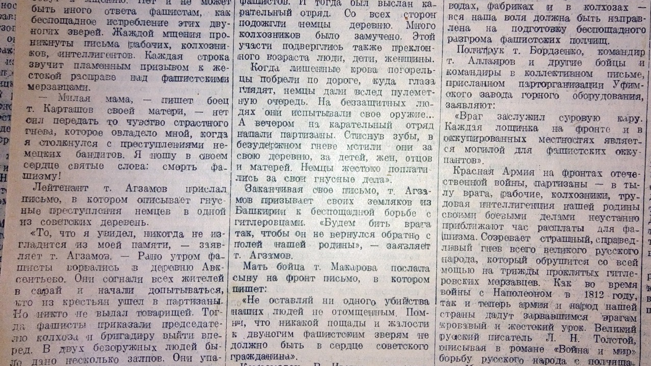 УФА, 12 фев 2020. /ИА «Башинформ»/. «Милая мама, нет сил передать то чувство страстного гнева, которое овладело мной, когда я столкнулся с преступлениями немецких бандитов». Письма с фронта, рассказывающие о зверствах фашистов, опубликовала газета «Красная Башкирия» в ноябре 1941 года. «Башинформ» продолжает знакомить читателей с материалами из Национального архива РБ.