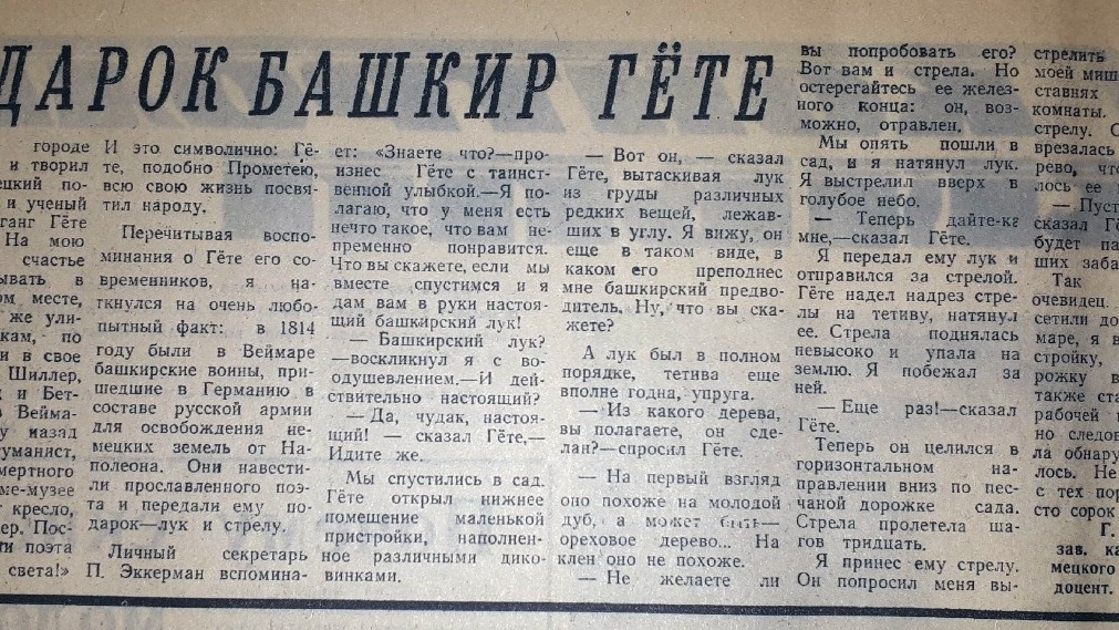 В газете рассказали, что, перечитывая воспоминания о Гёте его современников, ученый из Башкирии наткнулся на очень любопытный факт. В 1814 году были в Веймаре башкирские воины, пришедшие в Германию в составе русской армии для освобождения немецких земель от Наполеона. Они навестили прославленного поэта и передали ему подарок – лук и стрелу.
