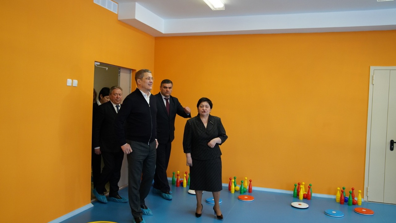 Глава республики осмотрел музыкальный и физкультурный залы, кабинеты для дополнительного образования детей, пищеблок, медицинский кабинет с изолятором и процедурным кабинетом. В учреждении имеется своя система видеонаблюдения, автоматическая пожарная сигнализация.