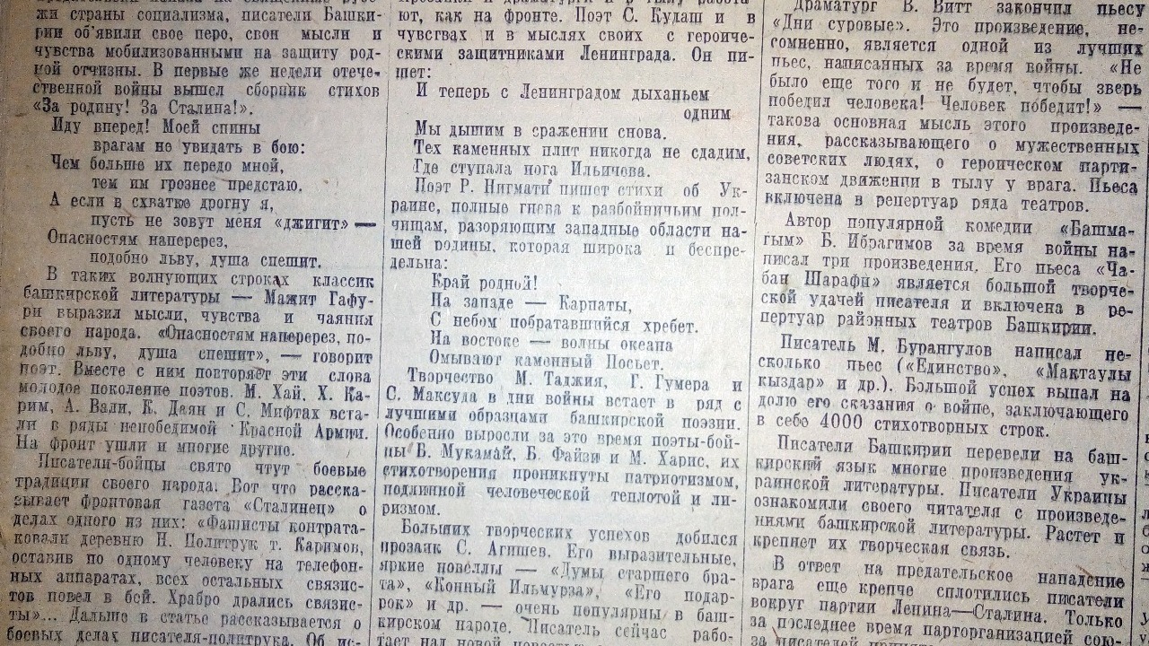 С начала войны башкирские драматурги написали около десяти произведений, продолжают в газете. Писатель Ахнаф Киреев заканчивал вторую одноактную пьесу. Его прежняя пьеса – «В одной семье» прочно вошла в репертуар театров Башкирии и пользовалась заслуженным успехом. Готовилась к печати его новая книга рассказов «Наш поход».
