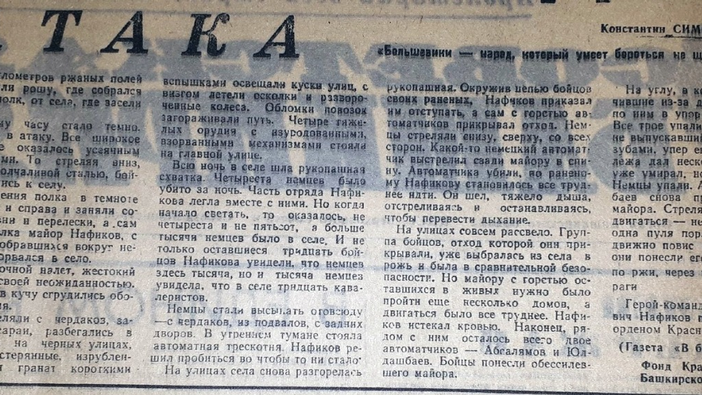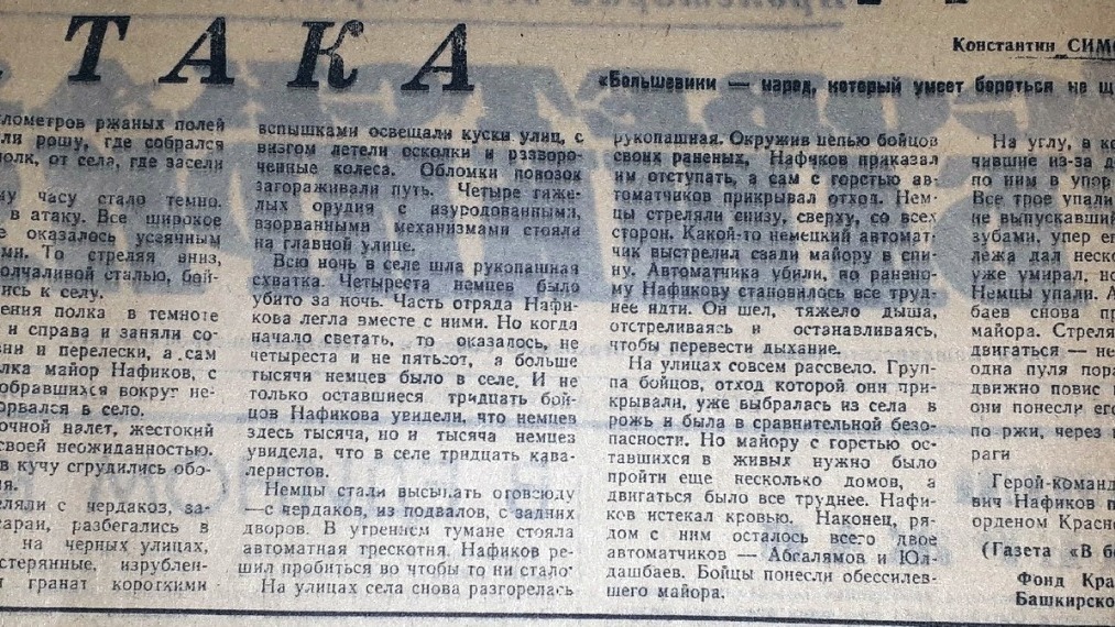Оставшиеся в живых тридцать бойцов майора Нафикова увидели, что вокруг тысяча немцев, и тысяча немцев увидела, что в селе тридцать кавалеристов. Хронику подвига героя Великой Отечественной войны опубликовала газета «Советская Башкирия» в 1967 году. «Башинформ» продолжает знакомить читателей с материалами из Национального архива РБ.