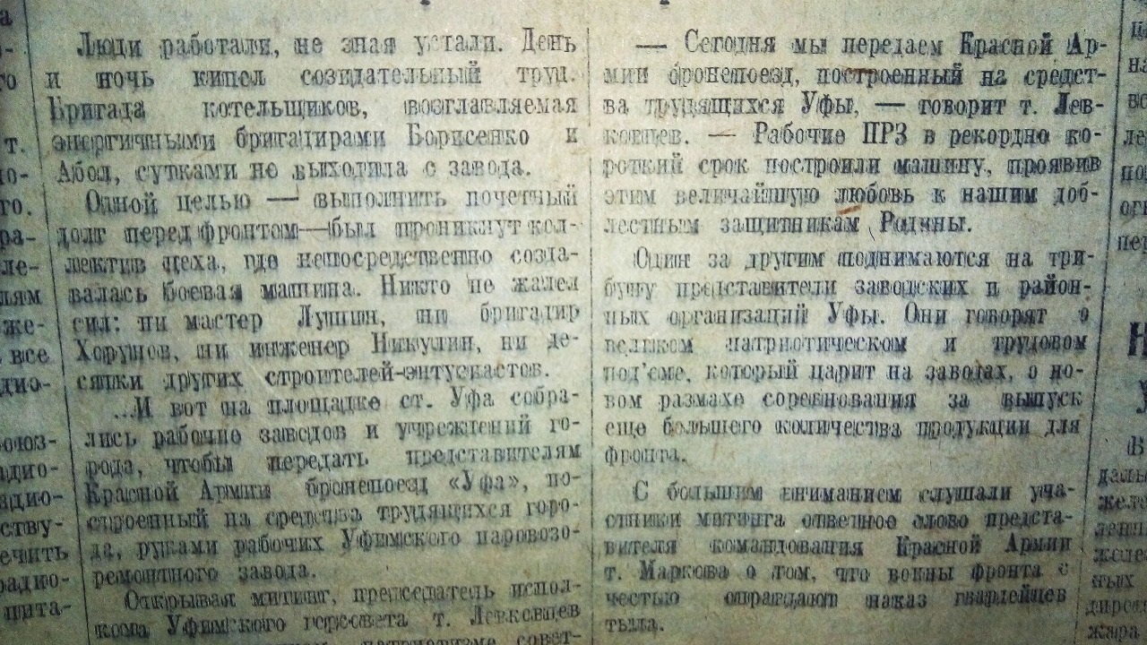 «Сегодня мы передаем Красной Армии бронепоезд, построенный на средства трудящихся Уфы, – говорил Левковцев. – Рабочие паровозоремонтного завода в рекордно короткий срок построили машину, проявив этим величайшую любовь к нашим доблестным защитникам Родины».