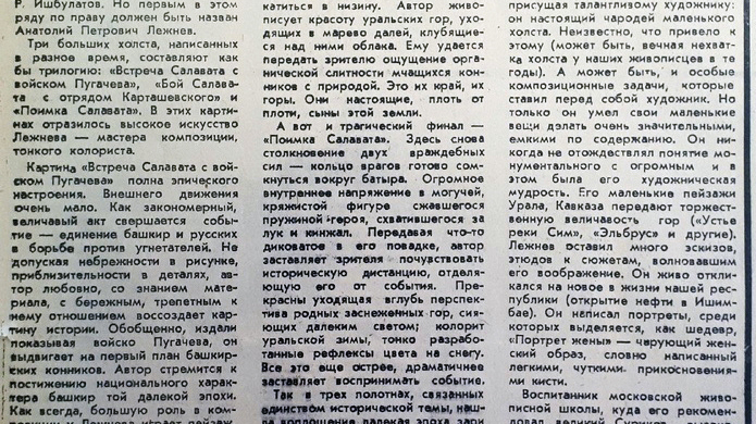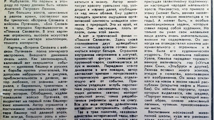 Три больших холста, написанных им в разное время, составляют как бы трилогию: «Встреча Салавата с войском Пугачева», «Бой Салавата с отрядом Карташевского» и «Поимки Салавата». В этих картинах отразилось высокое искусство художника Лежнёва – мастера композиции, тонкого колориста, говорится в газете.