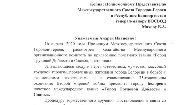 Белорецку присвоили почётное международное звание «Город трудовой доблести и славы». Об этом со ссылкой на Межгосударственный Союз городов-героев сообщил глава администрации Белорецкого района Андрей Иванюта.