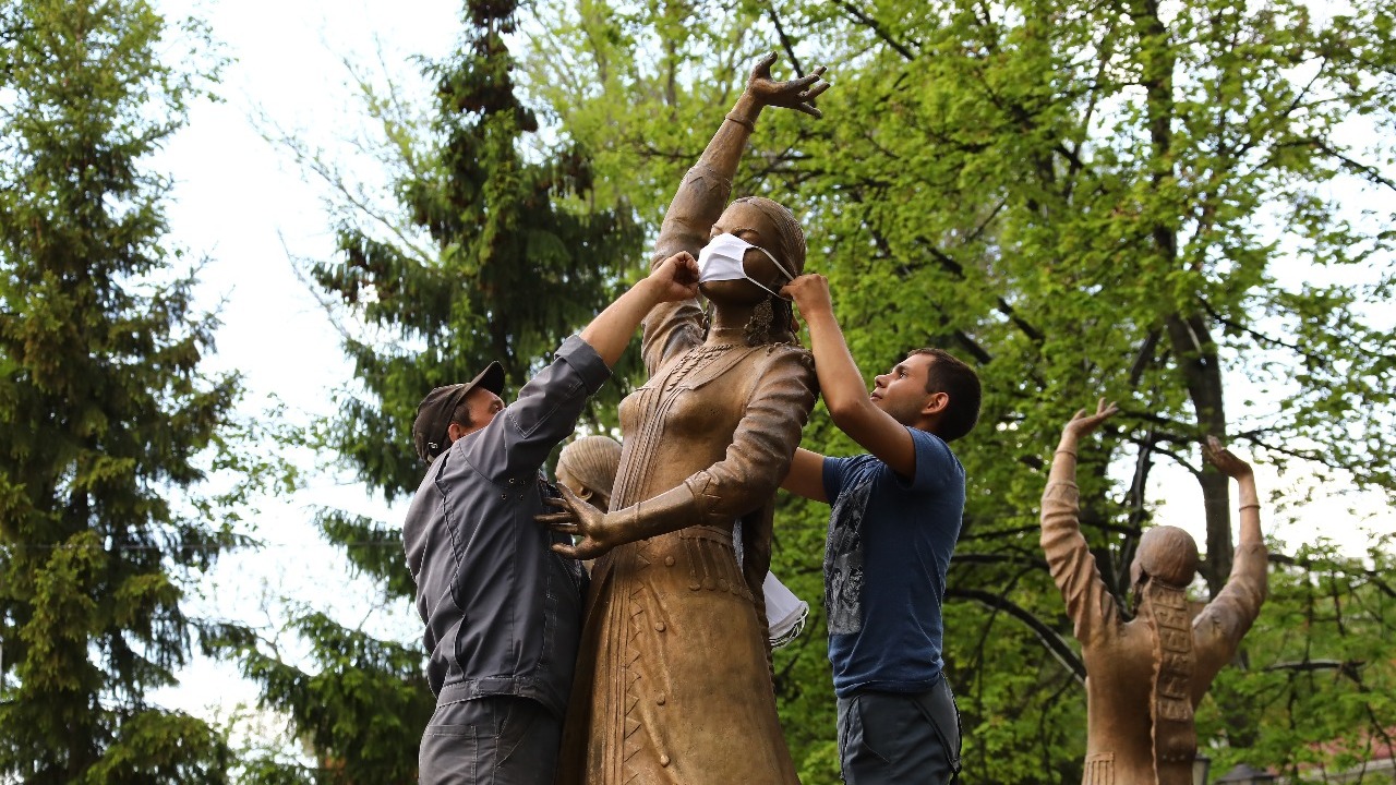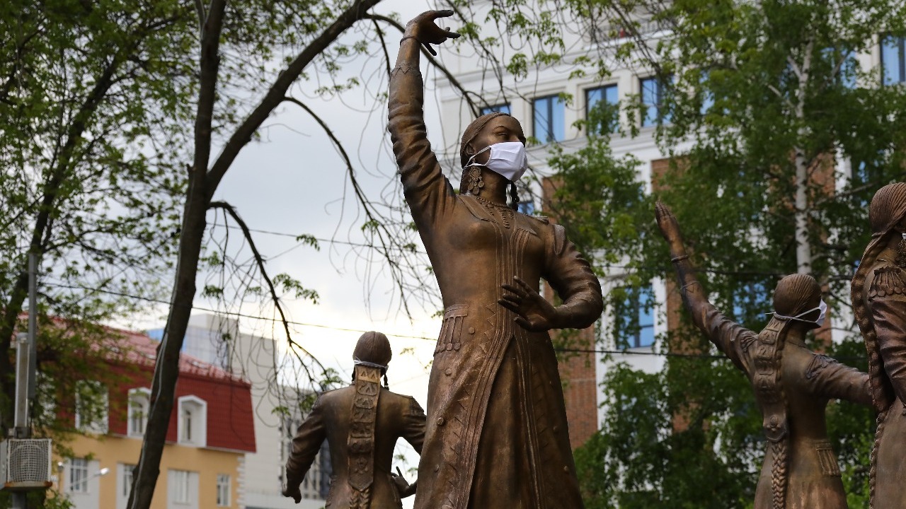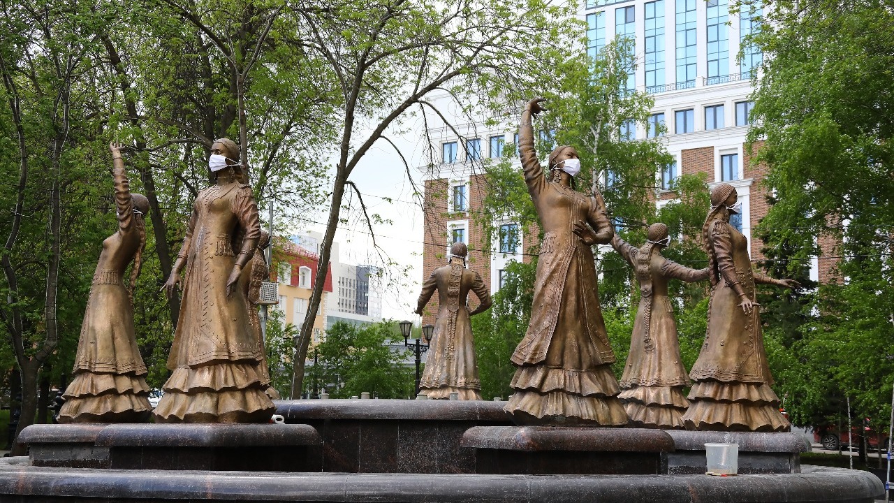 В Уфе скульптурам фонтана «Семь девушек» надели маски