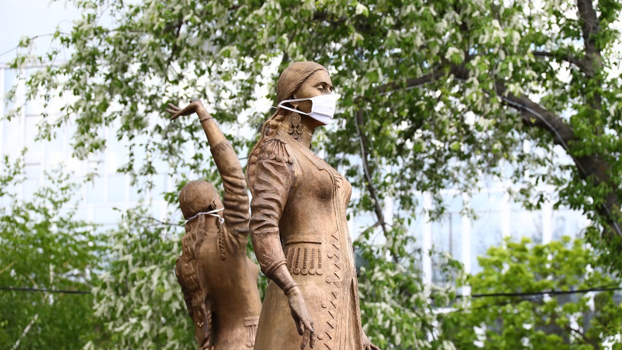 Мировой тренд с одеванием масок на транспорт и произведения искусства в условиях пандемии по коронавирусу пришел и в столицу Башкирии. В Уфе защитные маски появились на скульптурах фонтана «Семь девушек». Своеобразным флешмобом жителей, видимо, призывают обезопасить себя и окружающих от COVID-19 и соблюдать масочный режим.