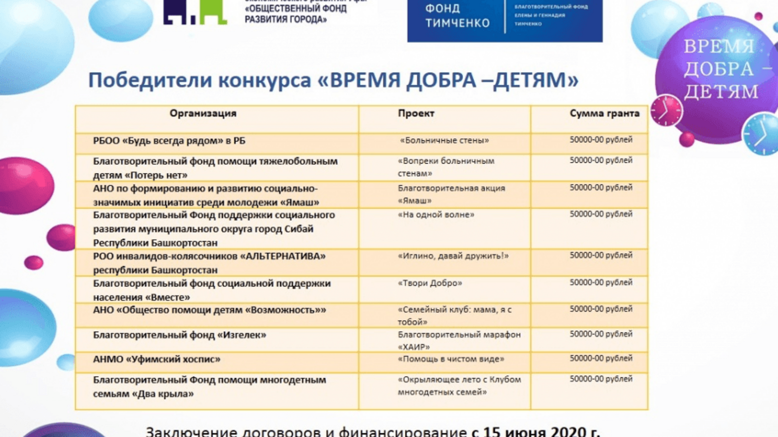 в период пандемии, будет выделена финансовая поддержка по итогам конкурса «Время добра - детям». Конкурс был организован Общественным фондом развития Уфы во взаимодействии с Благотворительным Фондом Тимченко. Об этом сообщает пресс-служба Общественной палаты региона.