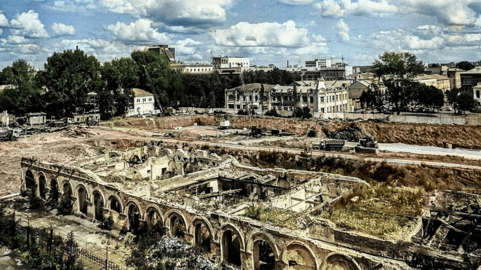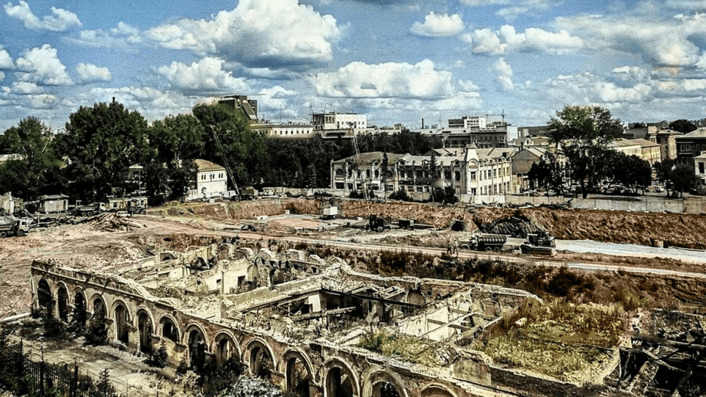 К 90-м от торговых рядов здесь остались развалины. В них группа «ДДТ» сняла клип на свою песню «Мертвый город» о чеченской войне.