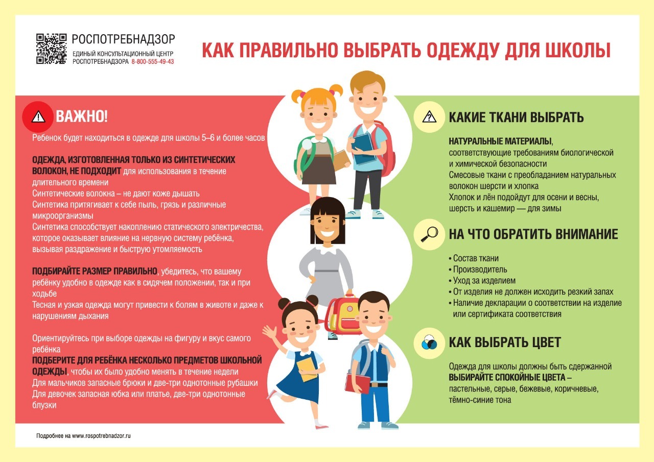 «При покупке школьной формы правильно подбирайте размер, убедитесь, что вашему ребенку в ней удобно как в сидячем положении, так и при ходьбе. Одежда не должна излишне стеснять движения, не должна быть слишком узкой, потому что тесная юбка или брюки приведут к болям в животе, а тесные рубашки и сарафаны могут нарушить дыхание. Кроме того, ориентируйтесь на фигуру и вкус самого ребенка, ведь форма должна не только быть красивой, качественной и модной, но и нравиться самому школьнику», — рекомендовали в региональном Роспотребнадзоре.