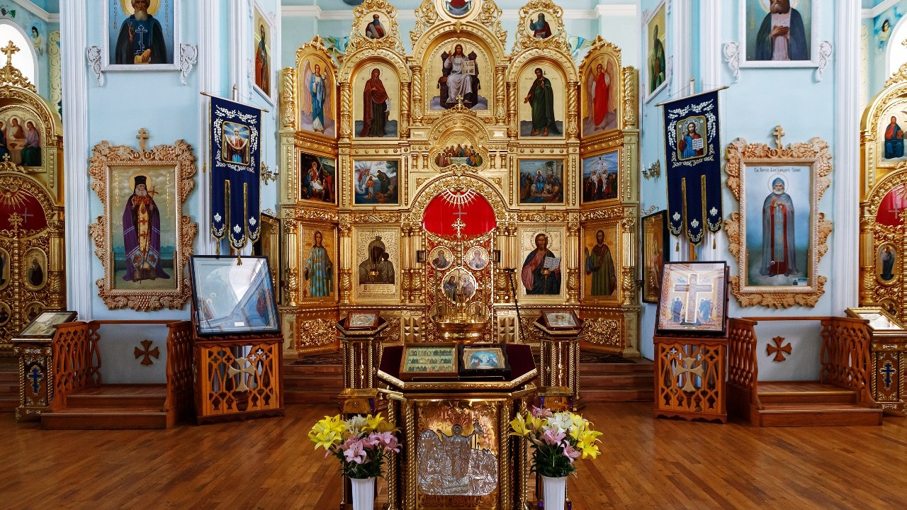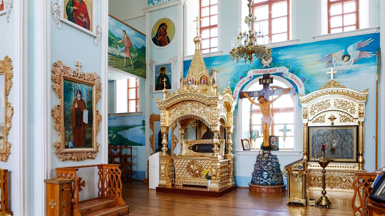 Внутреннее убранство собора поражает своей красотой: нежно-голубые стены, изящные узоры лепнины на потолке, настенные росписи, удивляющий своими размерами купол, нарядный иконостас, позолоченные вензеля.