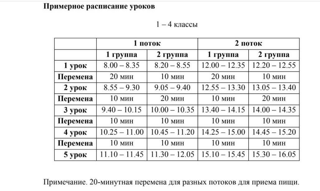 Продолжительность перерывов между уроками должна быть не более 10 минут, перерыв для питания школьников – не более 20 минут, а при организации посадки учащихся в две очереди – не более 30 минут.