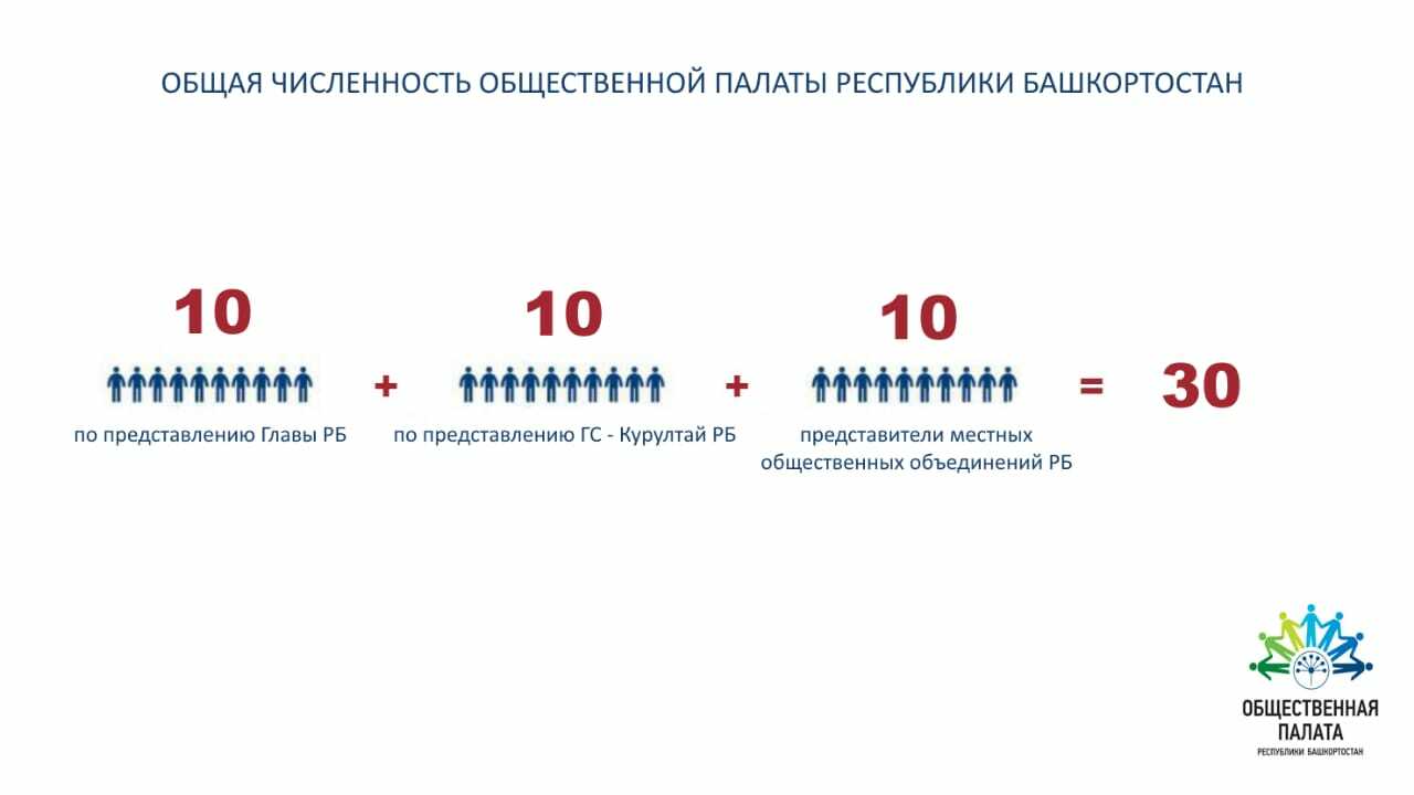 В состав Общественной палаты Башкирии войдут 30 человек. Одна треть утверждается Главой республики по представлению зарегистрированных на территории Республики Башкортостан структурных подразделений общероссийских и межрегиональных общественных объединений.