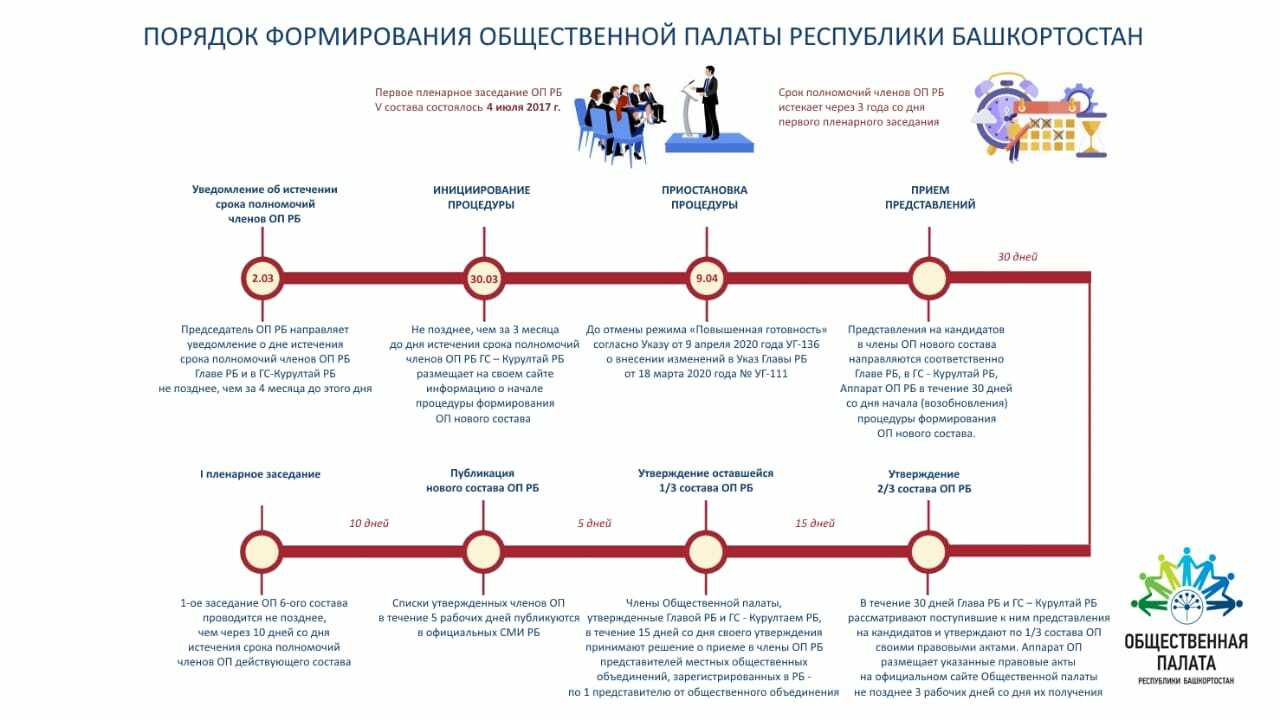 Утвержденные члены Общественной палаты определяют состав остальной одной трети членов ОП из числа кандидатур, представленных местными общественными объединениями, зарегистрированными на территории Республики Башкортостан.