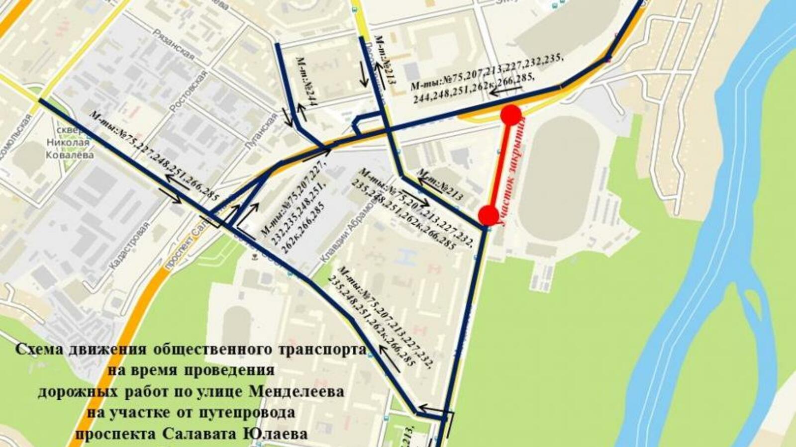 В Уфе в связи с ремонтом дороги до 6.00 5 октября закрыто движение транспорта по ул. Менделеева на участке от путепровода проспекта С. Юлаева до ул. Лесотехникума. На это время меняется схема движения маршрутов общественного транспорта.