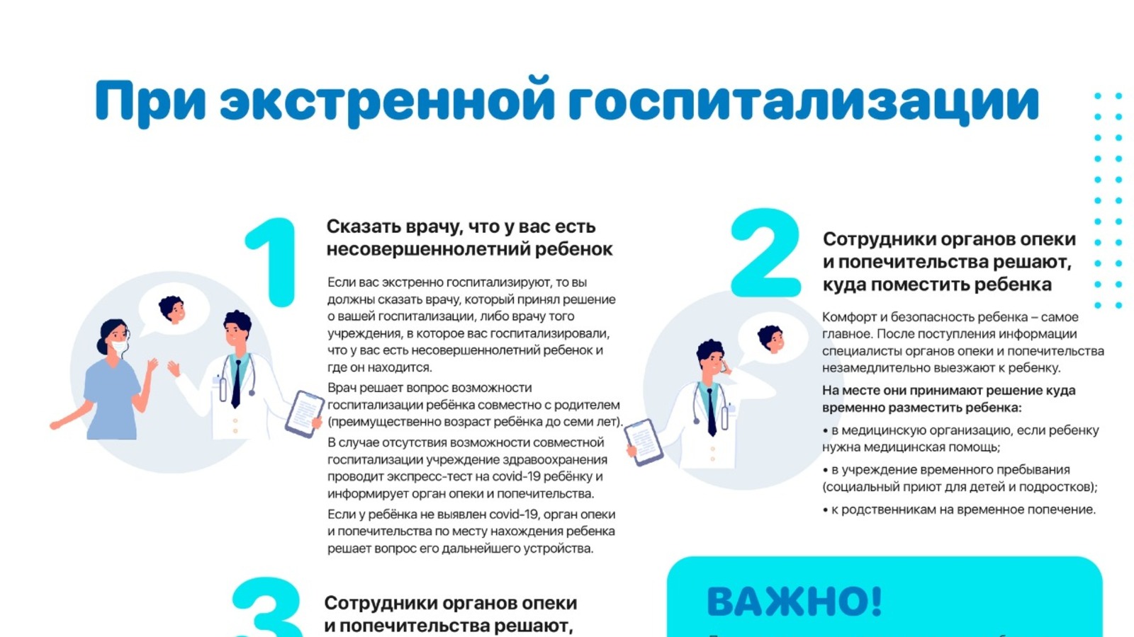 Как сообщили в региональном Министерстве семьи, труда и соцзащиты населения, если родители экстренно или планово оказались в больнице, и оставить ребенка не с кем, они могут либо лично, либо через лечащего врача обратиться в службу семьи, социальный приют или орган опеки и попечительства с заявлением на предоставление социальных услуг.