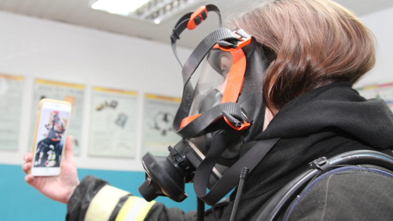 Добрались до ангара, где расположились тренировочные помещения. Перед входом в так называемую дымокамеру, нам показали, как подготовить и проверить дыхательный аппарат. На минуточку, баллон со сжатым воздухом весит 16 килограмм. Сотрудники газодымозащитной службы надевают его через голову на раз! Я же не смогла его даже поднять толком. В общем, взвалили мне его на спину, и тут я поняла, почему среди пожарных, работающих в таких спецкостюмах, нет женщин. Потому что это очень-очень-очень тяжело, не каждый мужчина справится с таким грузом! Ведь и сама боевка весит немало, плюс этот баллон – все вместе почти 30 килограмм. А потом в реальных условиях нужно со всем этим еще и быстро бегать, подниматься и спускаться по лестницам и этажам, искать в горящем задымленном помещении пострадавших, спасать их, вынося на руках. Я как это все представила, прониклась еще большим уважением к профессии спасателя.