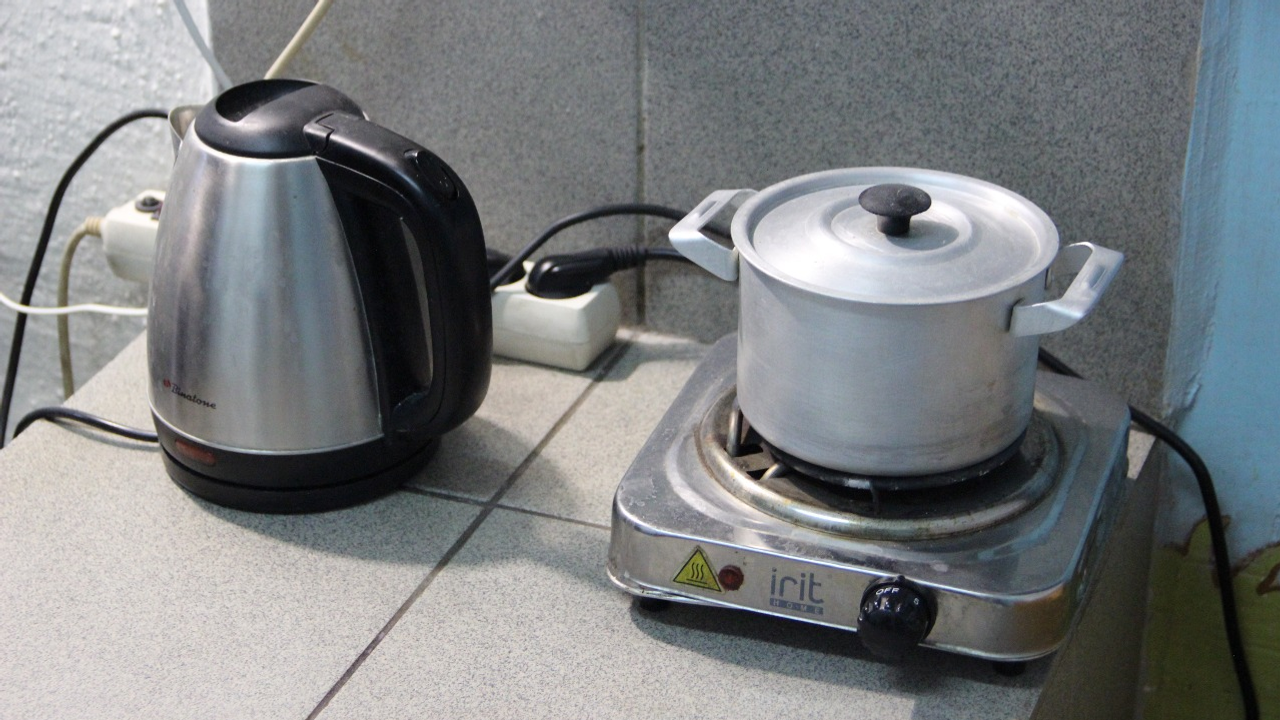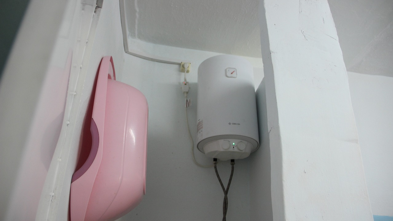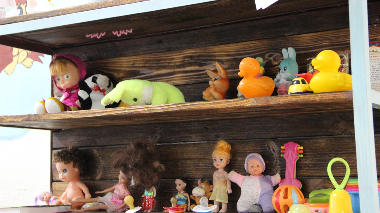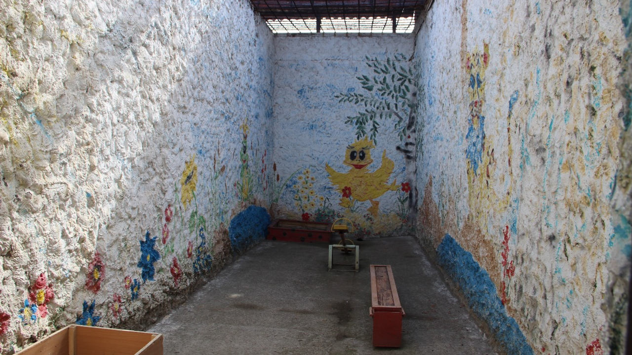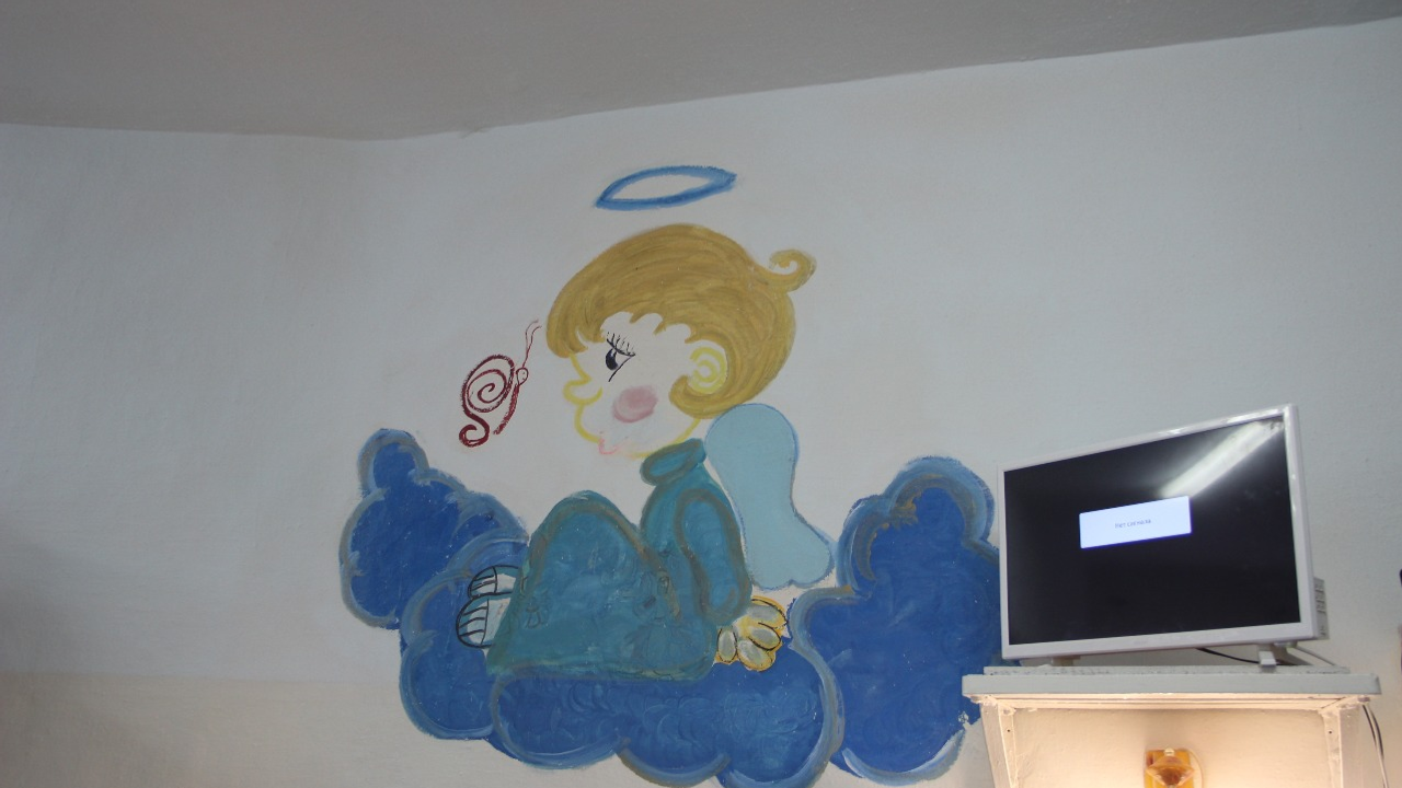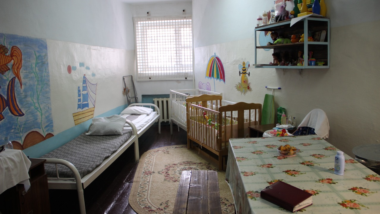 И вот мы остановились у нужной двери. Нас, конечно, уже ждали, ведь незапланированных свиданий не бывает. Камера молодой мамы оказалась двухместной, а точнее даже четырехместной: две кровати для взрослых и две кроватки для малышей. В помещении сразу бросились в глаза предметы быта: чайник с электроплиткой, большой обеденный стол со скамейками, телевизор, полка с игрушками, столик для ребенка, две тумбочки с аккуратно сложенными детскими вещами, а также душевая лейка, раковина, бойлер и ванночка в туалете, по центру – ковер. На стенах — нарисованные сказочные персонажи. И огромное окно с решеткой.