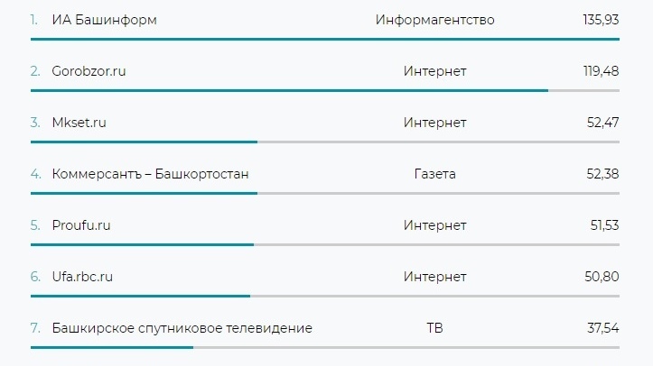 В десятку самых цитируемых СМИ республики также вошли газета «Коммерсантъ-Башкортостан» (52,38), интернет-ресурсы Prufy.ru (51,53), Ufa.rbc.ru (50,80), телеканал «Башкирское спутниковое телевидение» (37,54), радио «Эхо Москвы в Уфе» (37,32), газета «Комсомольская правда – Уфа» (36,96) и интернет-ресурс Tdnu.ru (29,06).