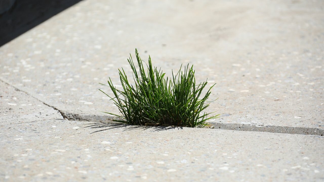 Местами природа пытается внести коррективы в серую бетонную пустошь: зелень прорывается сквозь плиты, радуя глаз.