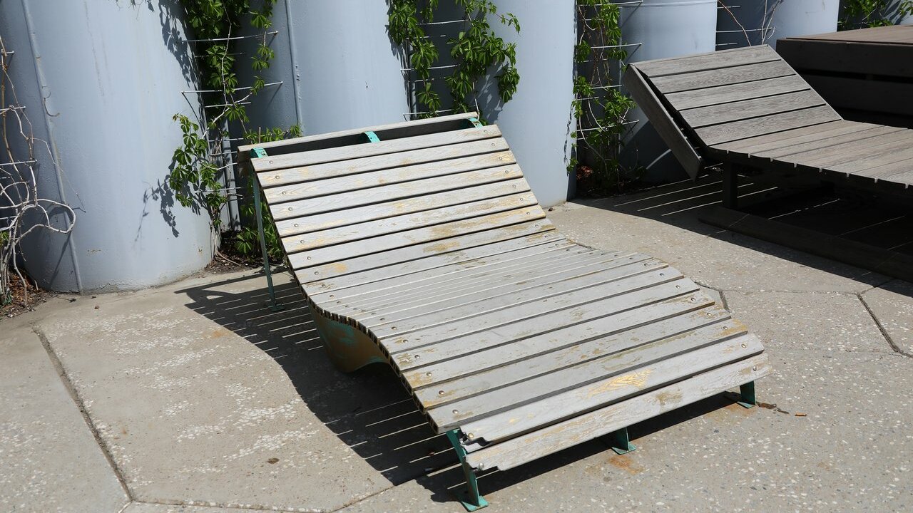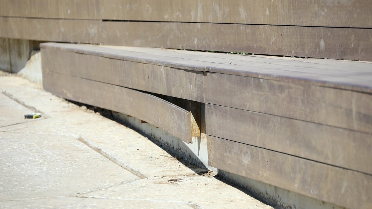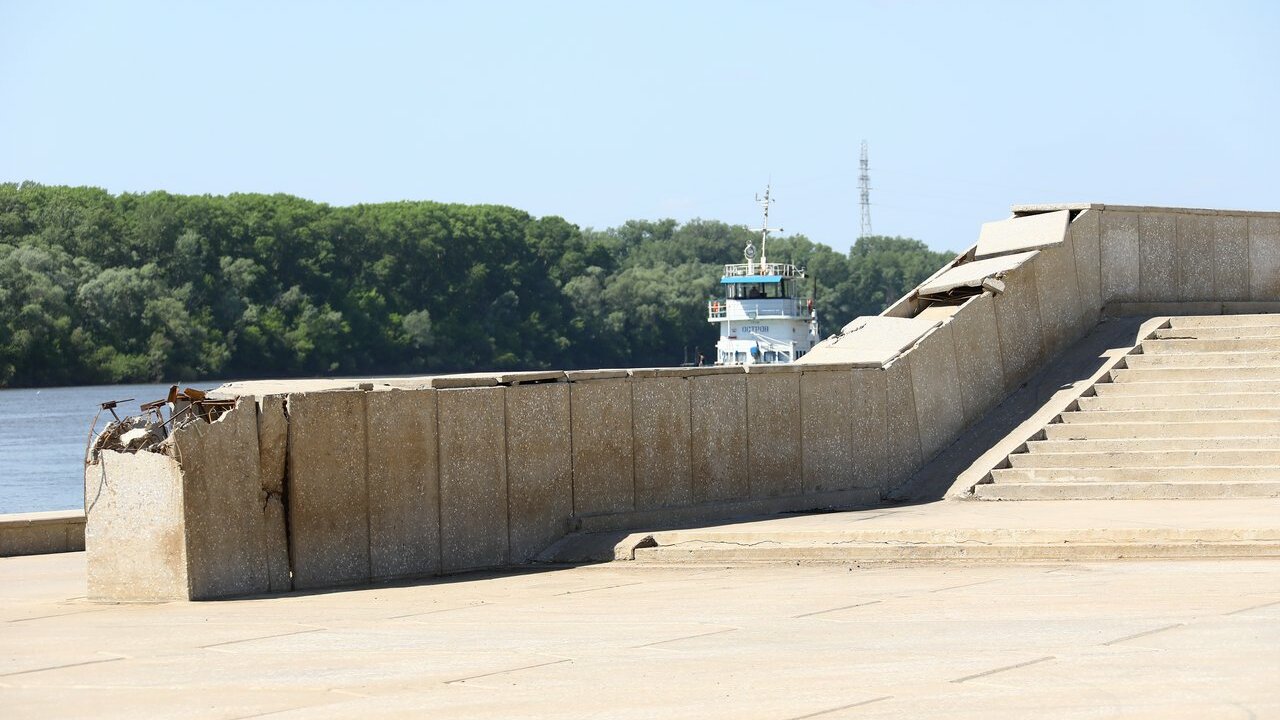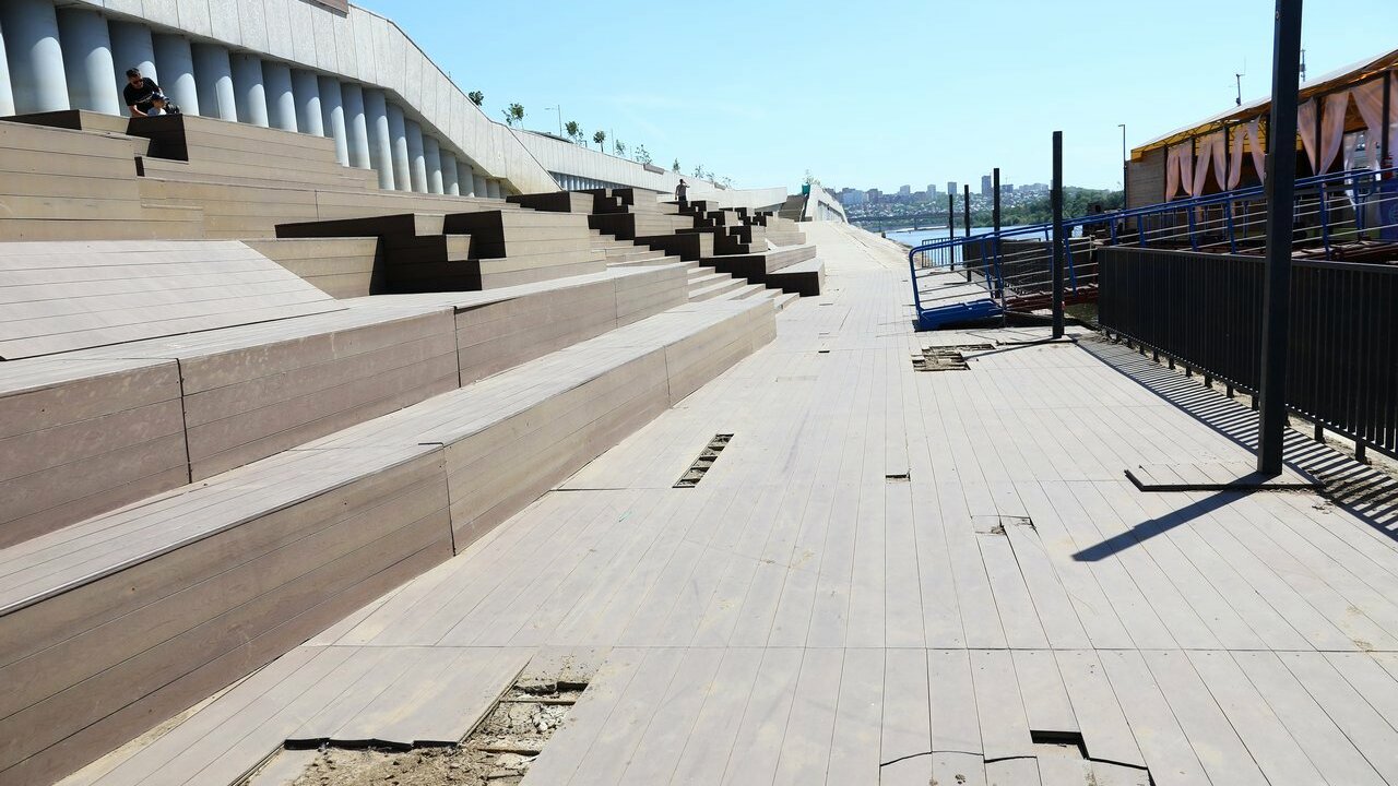 Как только с парковки перешли на сторону набережной, бросилась в глаза «чумазая», в черных пятнах плитка. Начали нашу «прогулку» с амфитеатра, до которого весной этого года также добралась вода. Здесь было пыльно, лежаки немного выцвели от солнца.
