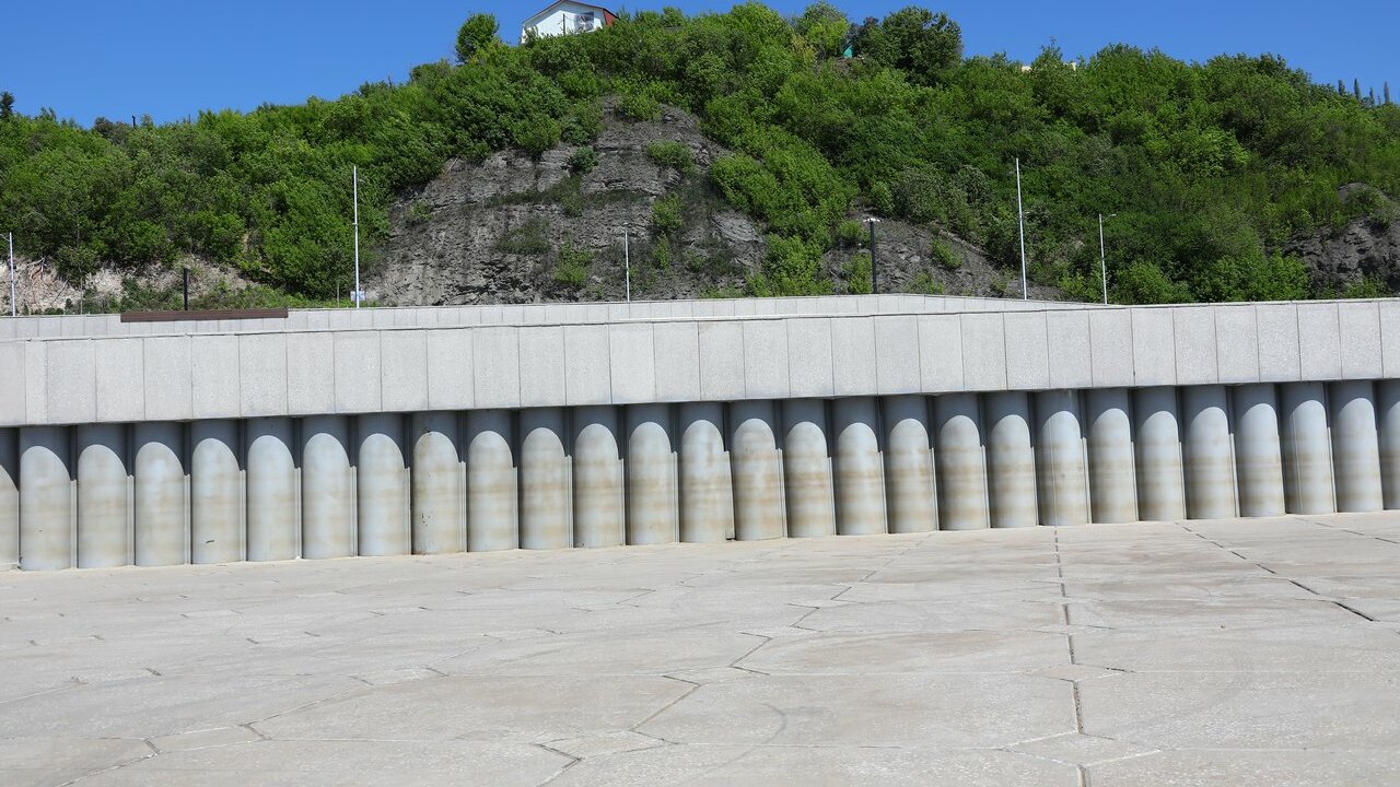 Здесь же бросилось в глаза ограждение у воды: железные столбики с цепью плавно переходили в столбики уже без цепи, а потом и вовсе в дырки в плитах, и лишь в конце «выжил» еще один столбик. Куда дели остальное? В металлолом? Или так и было задумано?
