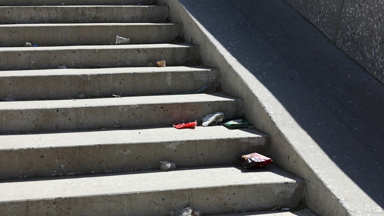 На ступеньках следы человеческой жизнедеятельности: пустые упаковки от сухариков, шоколадок, бутылки, использованные салфетки, бумажки, окурки и много чего другого.