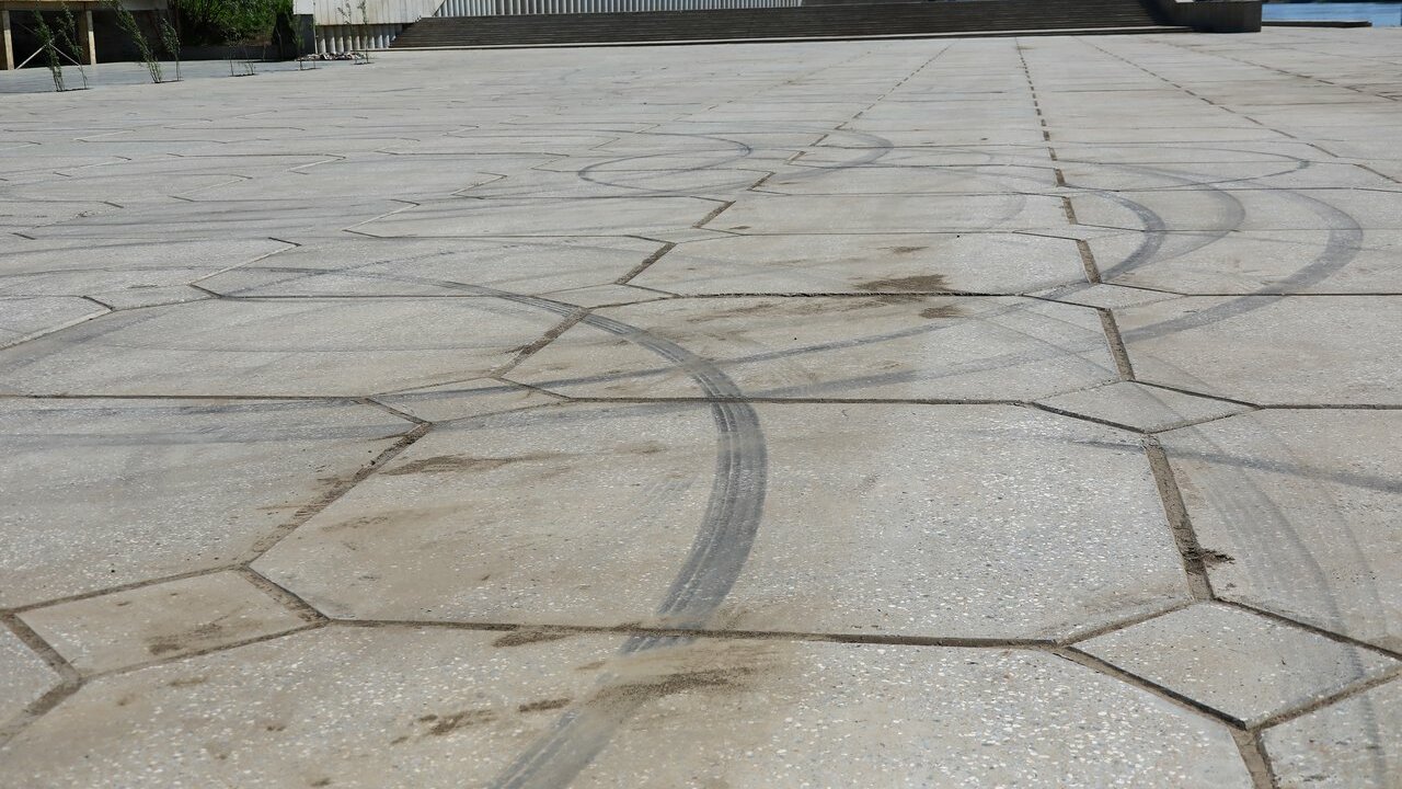 Площадку перед «Юностью» «украсили» следы от автомобильных шин, впрочем, не только здесь.