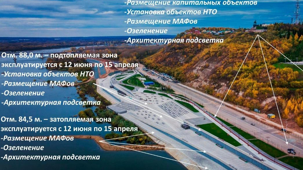 Верхний (на отметке от 93,5 над уровнем моря) из-за низкой (не более процента) вероятности затопления может эксплуатироваться круглый год. Здесь могут размещаться капитальные объекты и озеленение. На всем протяжении верхней прогулочной зоны уже установлены лавочки, урны, опоры освещения, высажены молодые деревья, смонтирована подсветка.