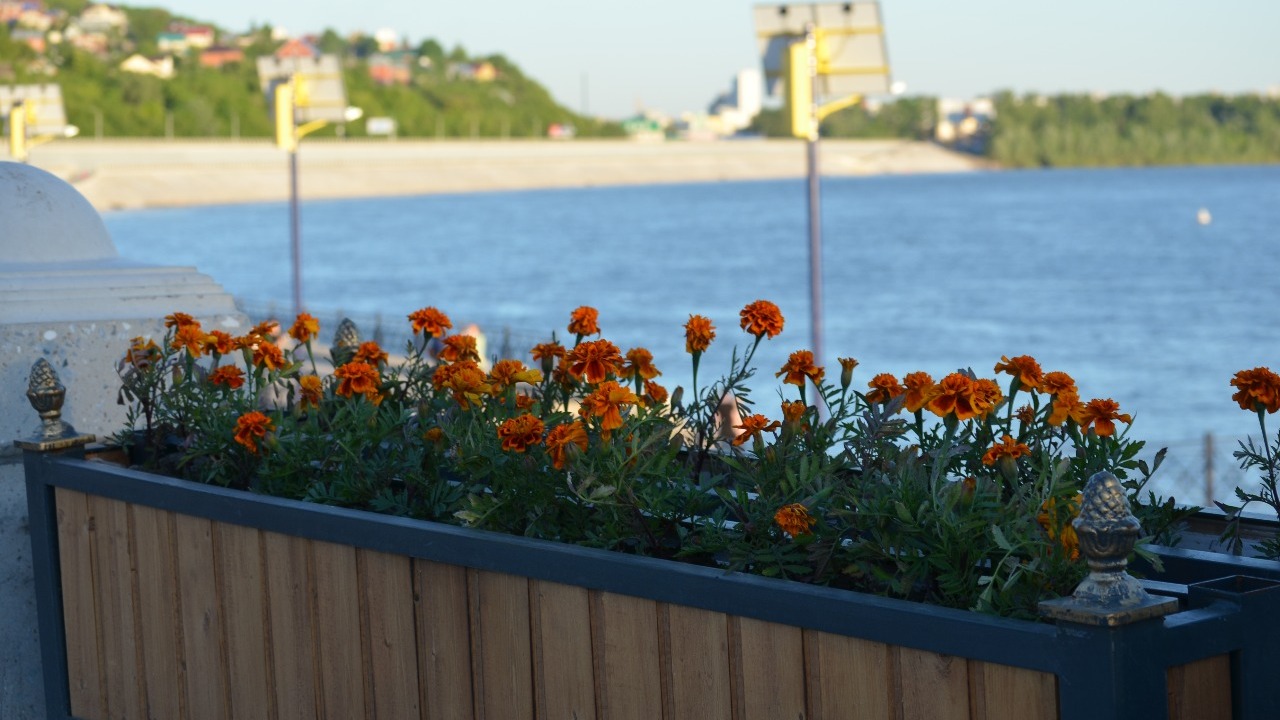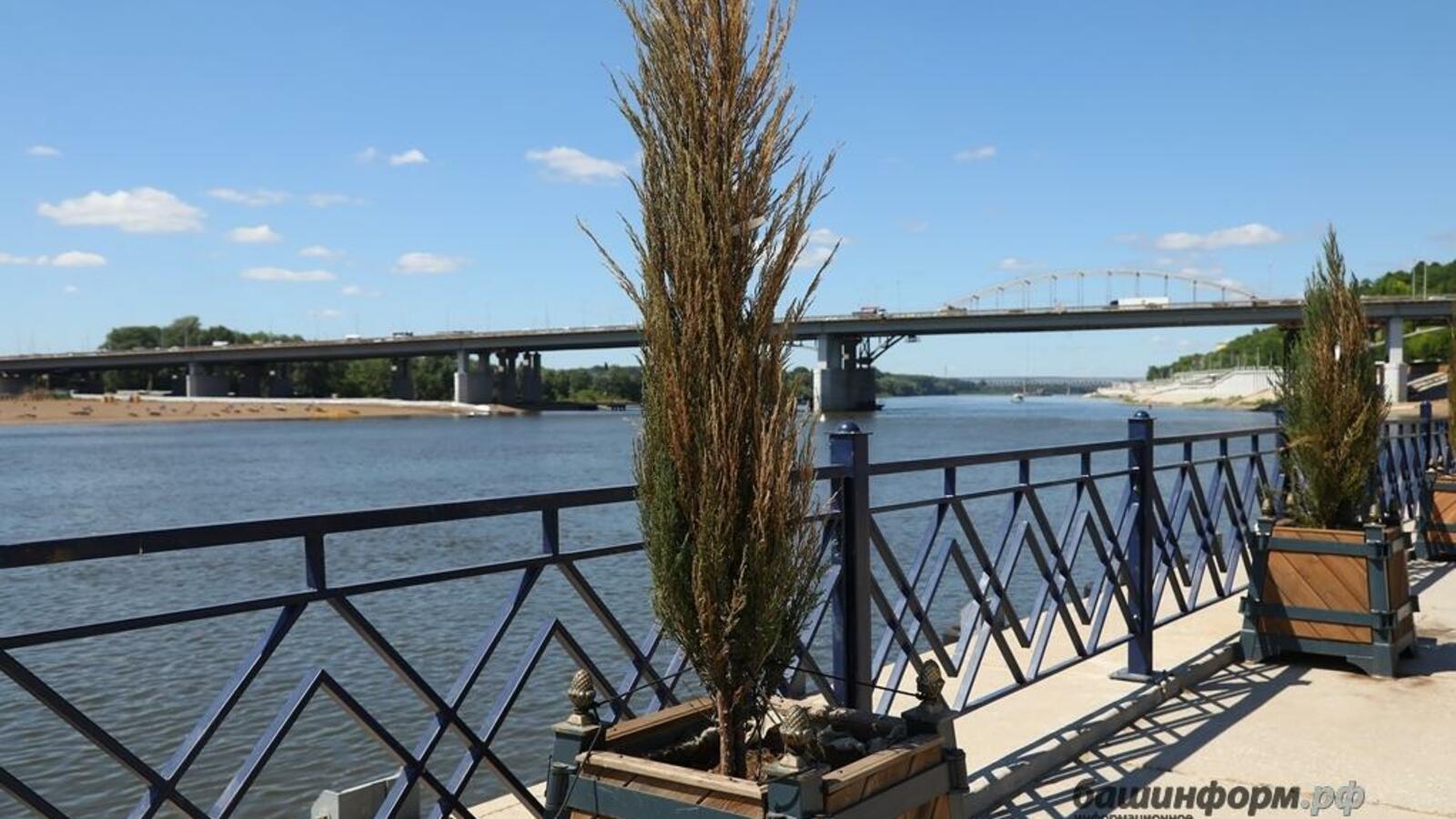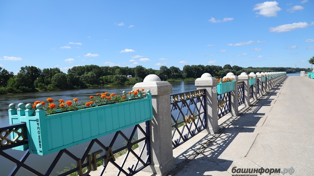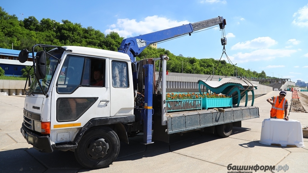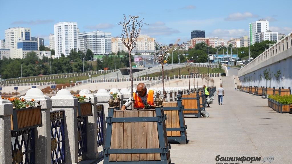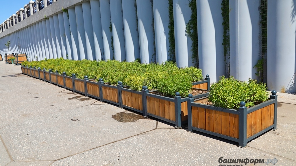 Бетонные плиты главной уфимской набережной реки Белой украшают более тысячи навесных ящиков с оранжевыми бархатцами, 500 деревьев в кадках, 328 ящиков с 1312 кустарниками, 2400 лиан винограда, около 200 лип на газонах, в районе амфитеатра 5442 кв. м газона. Об этом в интервью журналисту информационного агентства «Башинформ» рассказала представитель подрядной организации, выпускница БГАУ («ландшафтный дизайн») Венера Кинзябаева. Мастер курирует всю растительность на набережной: занимается посадкой большого объема деревьев, кустарников и цветов, расстановкой кадок, организовывает полив, осенью организует сбор и укрытие растений. По словам собеседницы, прикладываются большие усилия и вкладываются приличные средства, чтобы серые плиты разбавить зеленью и вдохнуть в них жизнь.