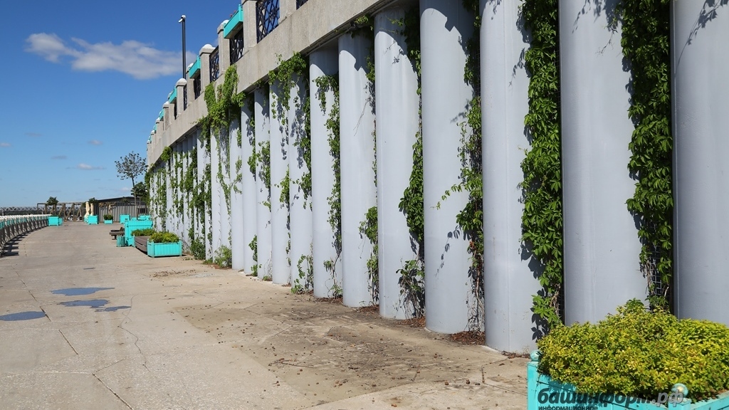 В целом, растения находятся в стрессовых условиях – в кадках, это для них ненормальные условия, ведь они должны расти в земле. Местами вы видите, что трубы обвивает зеленое растение – это виноград девичий. Он прекрасно подходит для этих условий: засухоустройчивый, может долго обходиться без полива, вредитель на него особо не нападает. Он растет как сорняк, ползет по стенам. Он посажен по всей набережной, молодые саженцы еще не успели прижиться, кто-то не успел вытянуться. В течение двух сезонов могут образоваться джунгли.