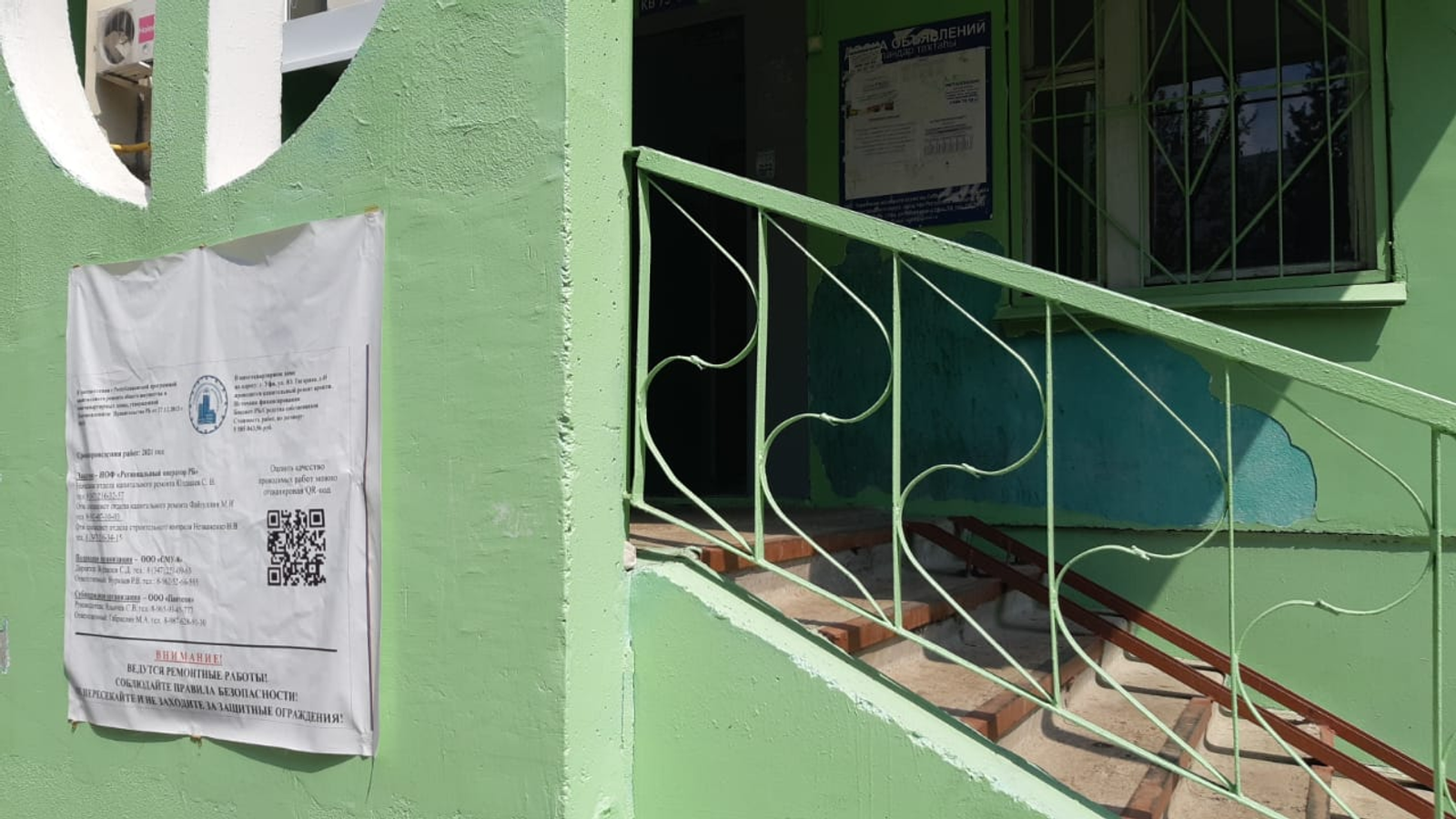 В паспорте объекта, размещенном на крыльце дома, указаны данные по ремонту. Сообщается, что в многоквартирном доме по улице Гагарина, 45 проводится капитальный ремонт кровли. Источник финансирования: бюджет РБ и средства собственников. Стоимость работ по договору составляет 5 585 043,96 руб. Сроки — 2021 год. Заказчиком выступает Региональный оператор РБ. Работы ведутся подрядной организацией «СМУ-8» и субподрядной компанией «Пантеон».