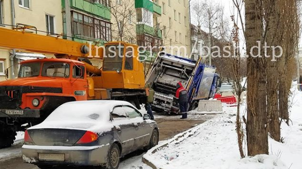 Мусоровоз удалось вытащить спустя несколько часов с помощью автокрана.