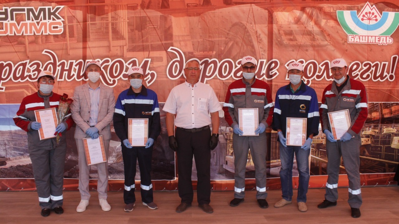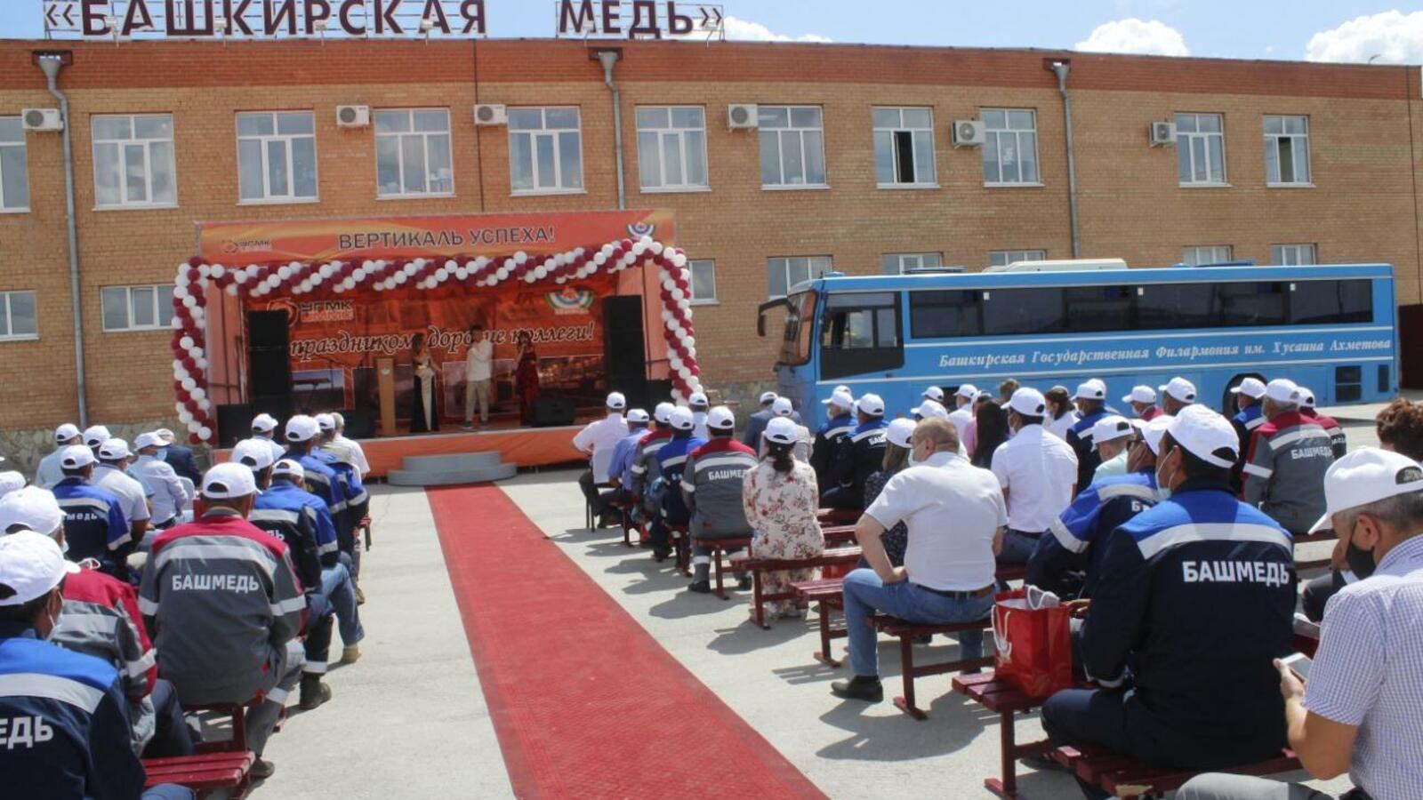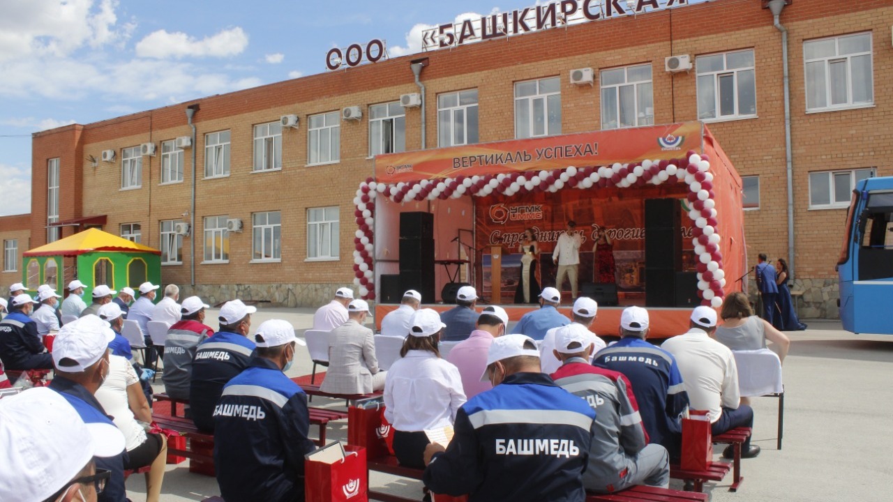 Свой праздник работники ООО «Башкирская медь» встретили на свежем воздухе с соблюдением всех рекомендаций Роспотребнадзора. На площади перед административным корпусом установили сцену, расставили скамейки, на которых работники предприятия сидели в масках, соблюдая социальную дистанцию.