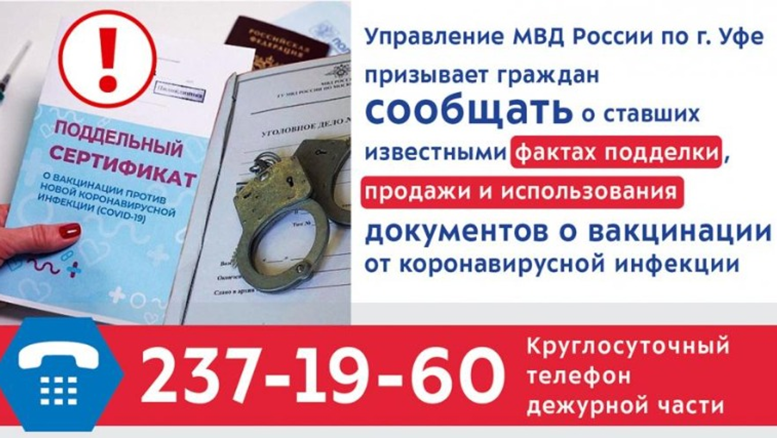 Управление МВД России по Уфе призывает граждан сообщать о ставших известных им фактах подделки, продажи и использования документов о вакцинации от COVID-19. Круглосуточный телефон дежурной части: 8 (347) 237-19-60.