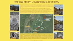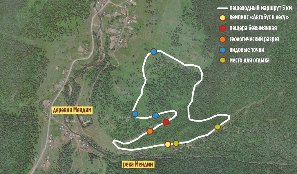 Туристский пешеходный маршрут под названием «Геологический разрез Мендим» составляет 5 км и расположен вдоль реки Мендим к востоку от одноимённой деревни Гафурийского района Башкортостана. Маршрут стартует у подножия скал рядом с кемпингом «Автобус в лесу» – далее следует подъем вдоль скального участка на вершины останцев выветривания, где можно найти древние окаменелости и посетить две небольшие пещеры. Там открывается живописный вид на окрестности кемпинга, деревню и долину реки Мендим. Далее маршрут проходит по вершине горы, чередуется густым лесом и открытыми полянами, и спускается к правому берегу реки Мендим.