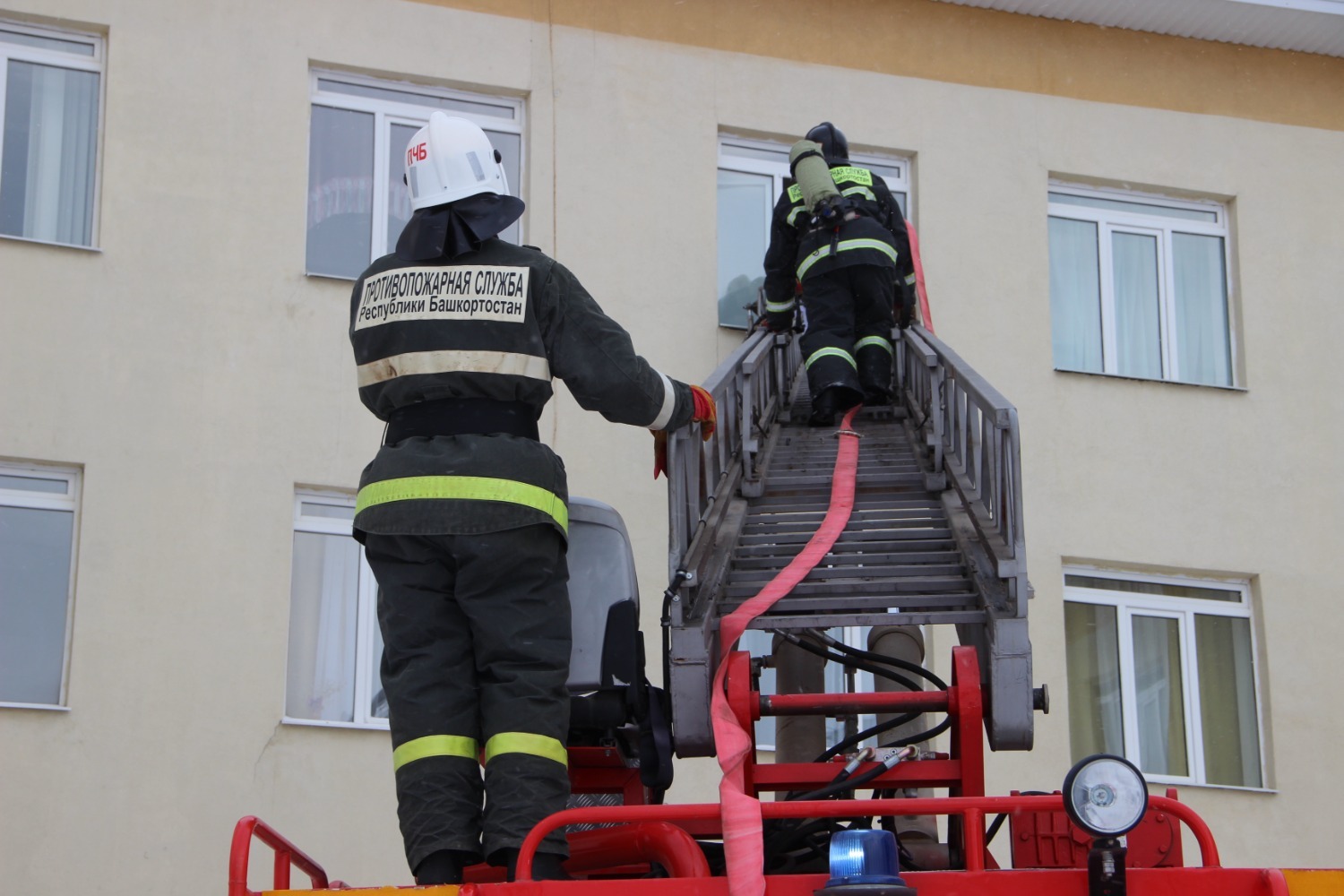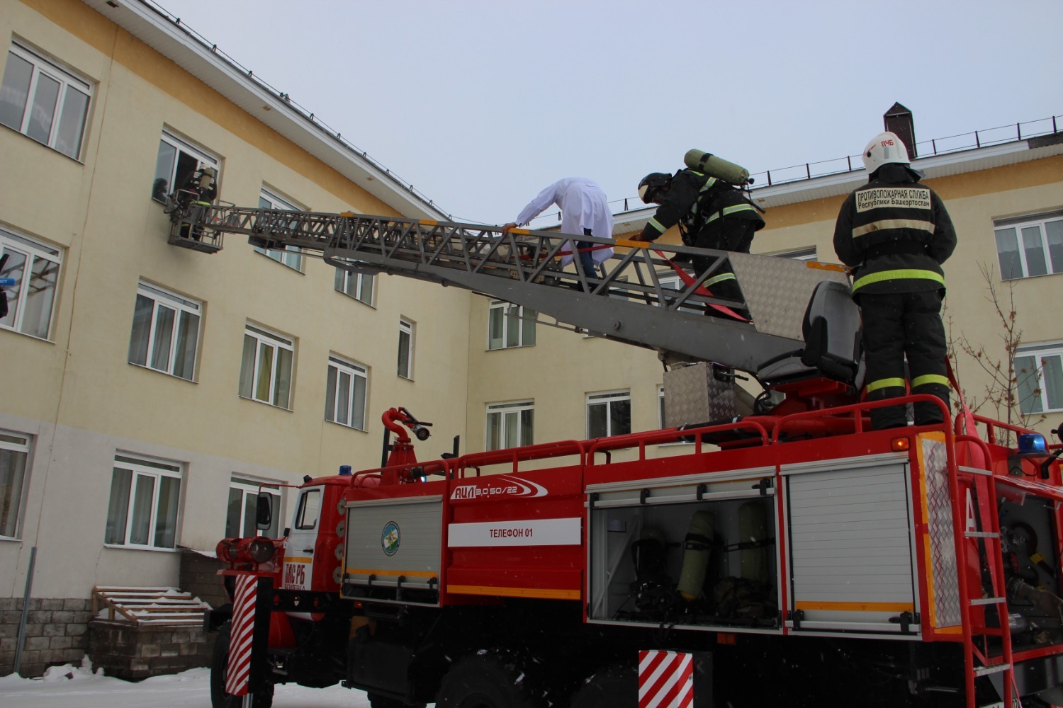«По тактическому замыслу, в одной из палат психиатрического корпуса условно произошло возгорание. В диспетчерскую поступил сигнал. Своевременно выдвинулся дежурный караул. По прибытии было эвакуировано 37 пациентов и сотрудников. В помещении корпуса остались заблокированными два условных пострадавших: один на втором этаже, второй – на третьем этаже. Звено ГДЗС проникло в здание, обнаружило пострадавшего, а также очаг условного возгорания. Надев маску спасаемого, вынесли человека на улицу и передали медикам. Второе отделение с помощью лестницы поднялось к окну третьего этажа, где по тактическому замыслу остался заблокированным медперсонал. Сотрудника эвакуировали с верхних этажей. Предварительная причина – короткое замыкание электропроводки», — пояснил руководитель Центрального отряда Противопожарной службы Госкомитета РБ по ЧС Линар Марданов.