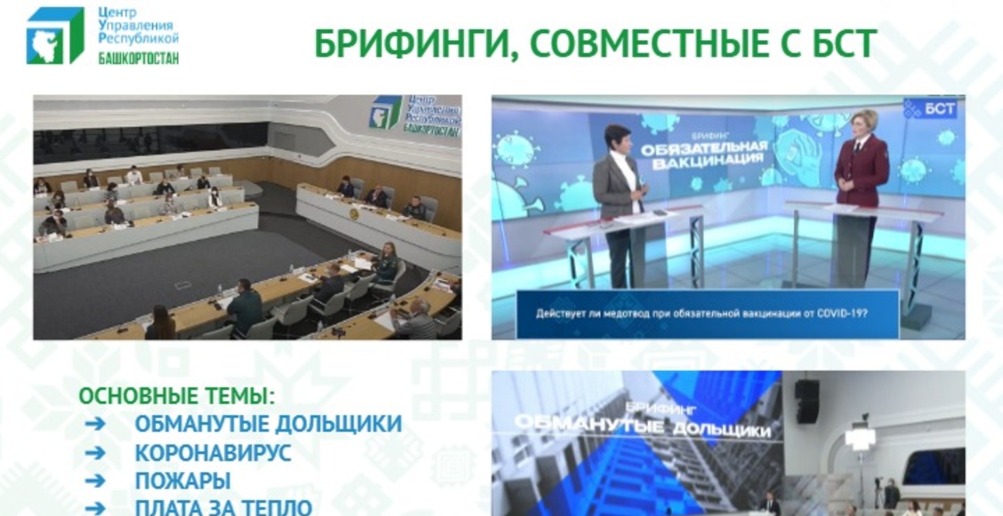 Еще один блок работы Центра управления республикой — прямые эфиры в соцсетях на злободневные и актуальные темы. С 25 августа проведено 93 прямых эфира. Кроме того, ЦУР совместно с БСТ организует брифинги на те или иные темы. С 21 октября в утренней программе «Салям» стартовали прямые включения о текущей работе Центра.