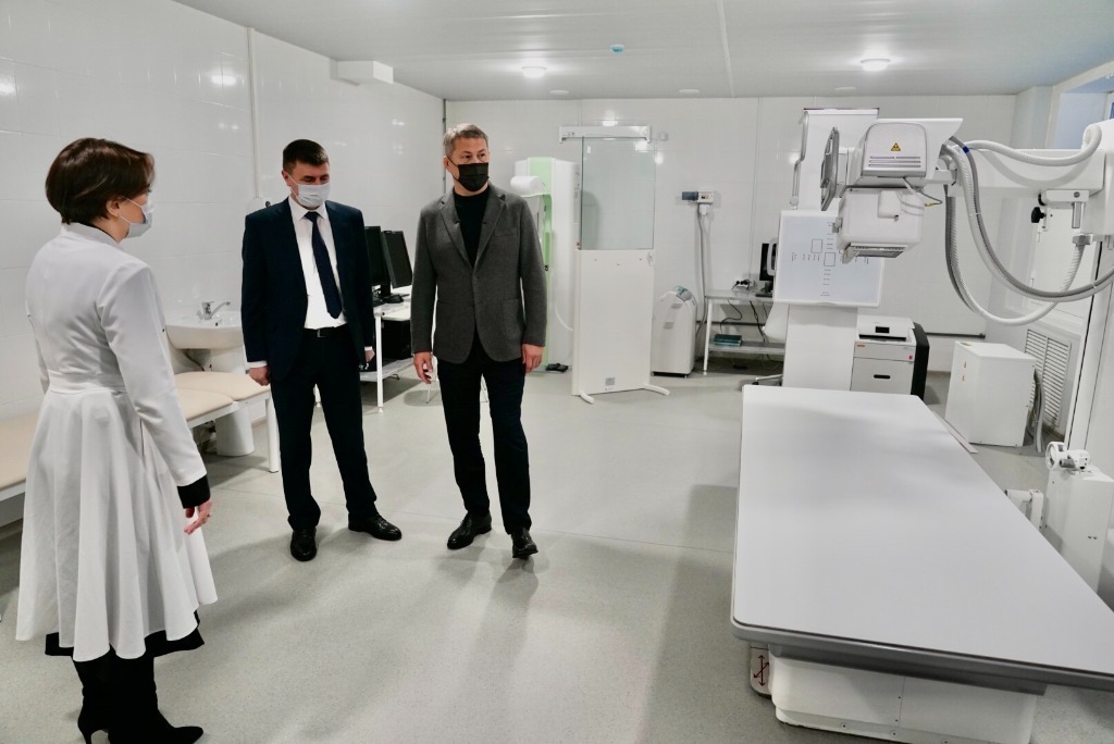 Глава республики осмотрел врачебные кабинеты, операционный блок, рентгенологическое отделение, оснащённые всем необходимым оборудованием. Здесь также будут действовать клинико-диагностическая лаборатория, отделение эндоскопии, женская консультация, детское отделение. Рядом с новым зданием установили газовую котельную и трансформаторную подстанцию.